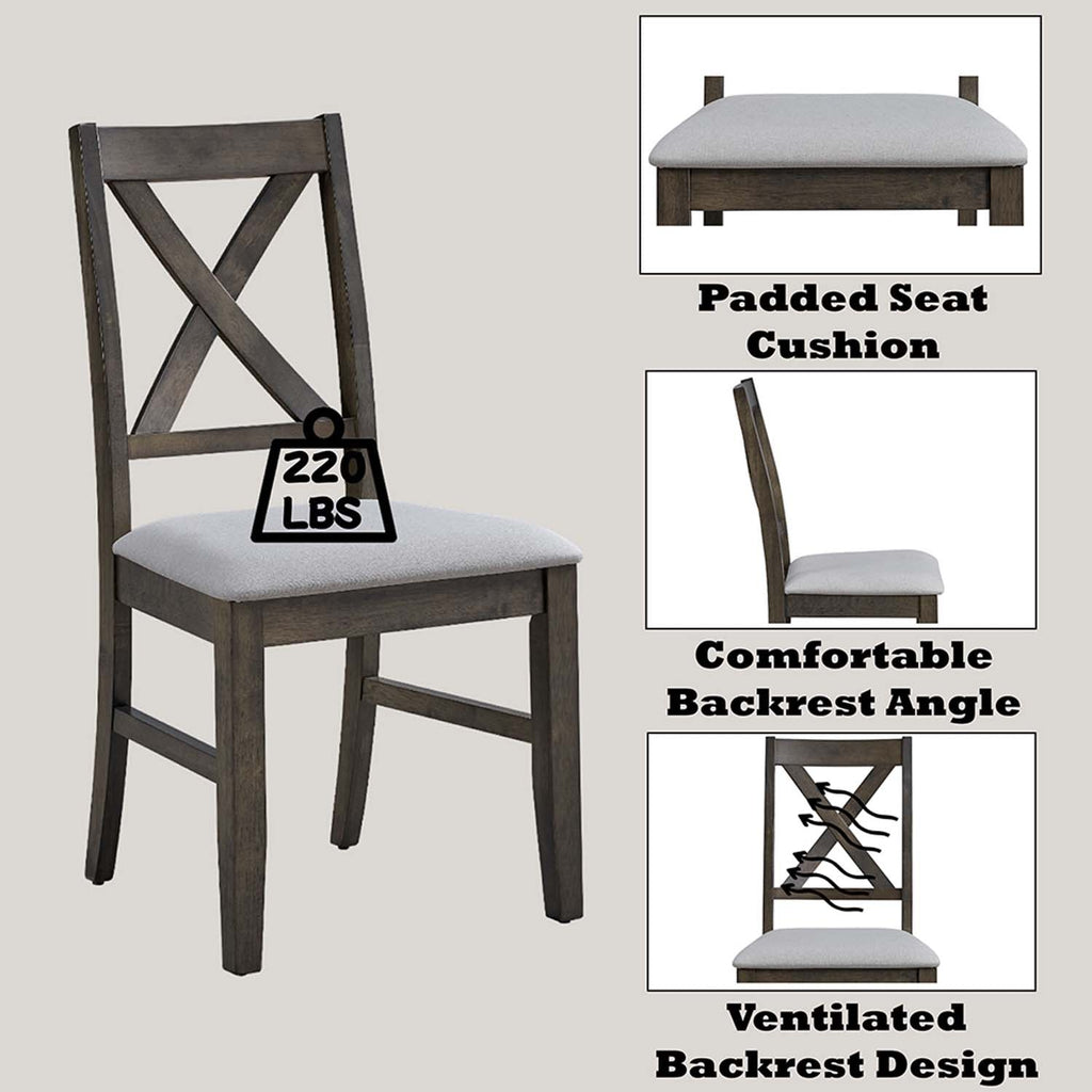 This Marit dining set features a stylish gray finish and an eye-catching "X" shape leg design, offering both elegance and stability. The accompanying chairs and bench come with padded seat cushions, providing comfort for extended gatherings. Perfect for modern and rustic interiors alike, this dining set combines functionality with contemporary charm, making it an inviting centerpiece for family meals and entertaining guests. Enhance your dining space with this beautiful and practical set.