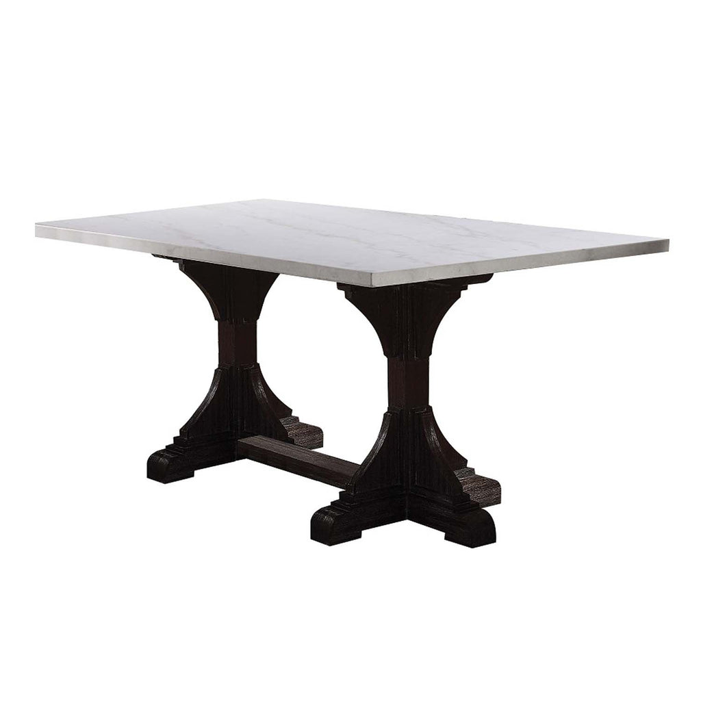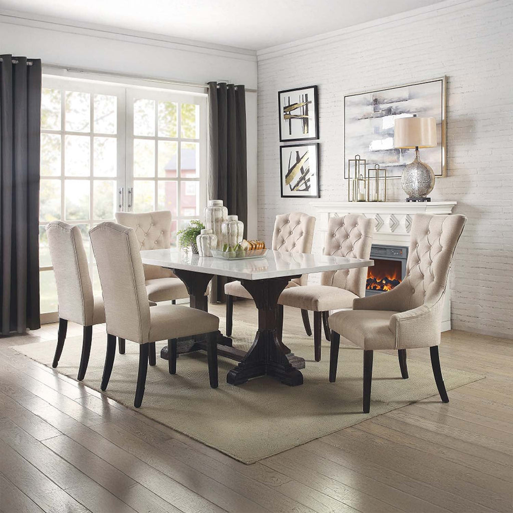 With smooth white marble over a weathered espresso trestle base, the Gerardo dining table demonstrates the easy elegance of transitional design. Matching side and arm chairs feature button tufted seat backs and tapered wooden legs in the same lovely weathered espresso finish. The optional matching server features the same beautiful white marble top and weathered espresso finish. To create a refined yet relaxed dining space, look no further than the Gerardo dining collection.