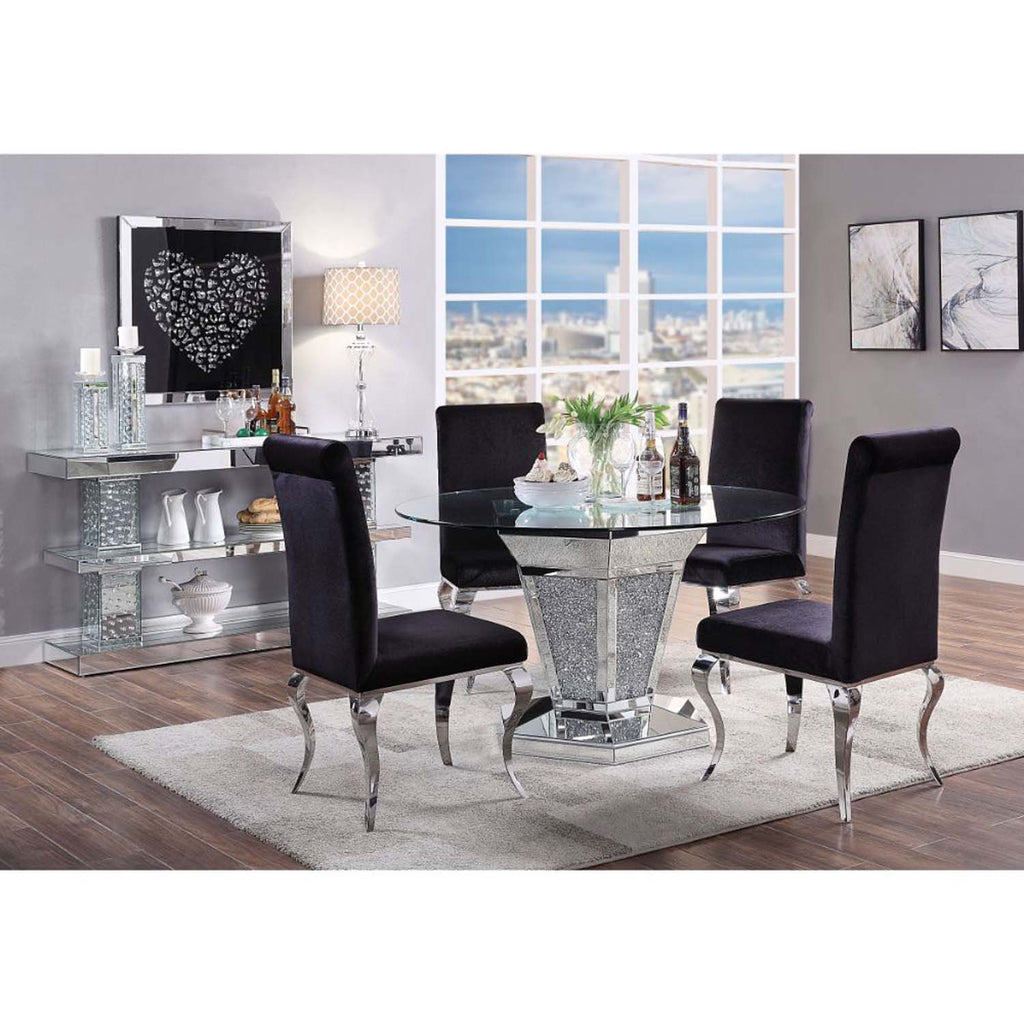 Cultivate a contemporary aesthetic in your entertainment ensemble with this distinctive Noralie dining table. Offering a modern twist on a classic pedestal-style silhouette, this design showcases an angular base with mirror and faux diamond inlay and unique X shape pedestal base. Sleek and stunning, this contemporary table is complemented by the 15-mm tempered clear glass top. Both elements have come together to produce a truly visionary table that will make dinner parties all the more stylish. Enhance your room Decor with this stunning dining room table.