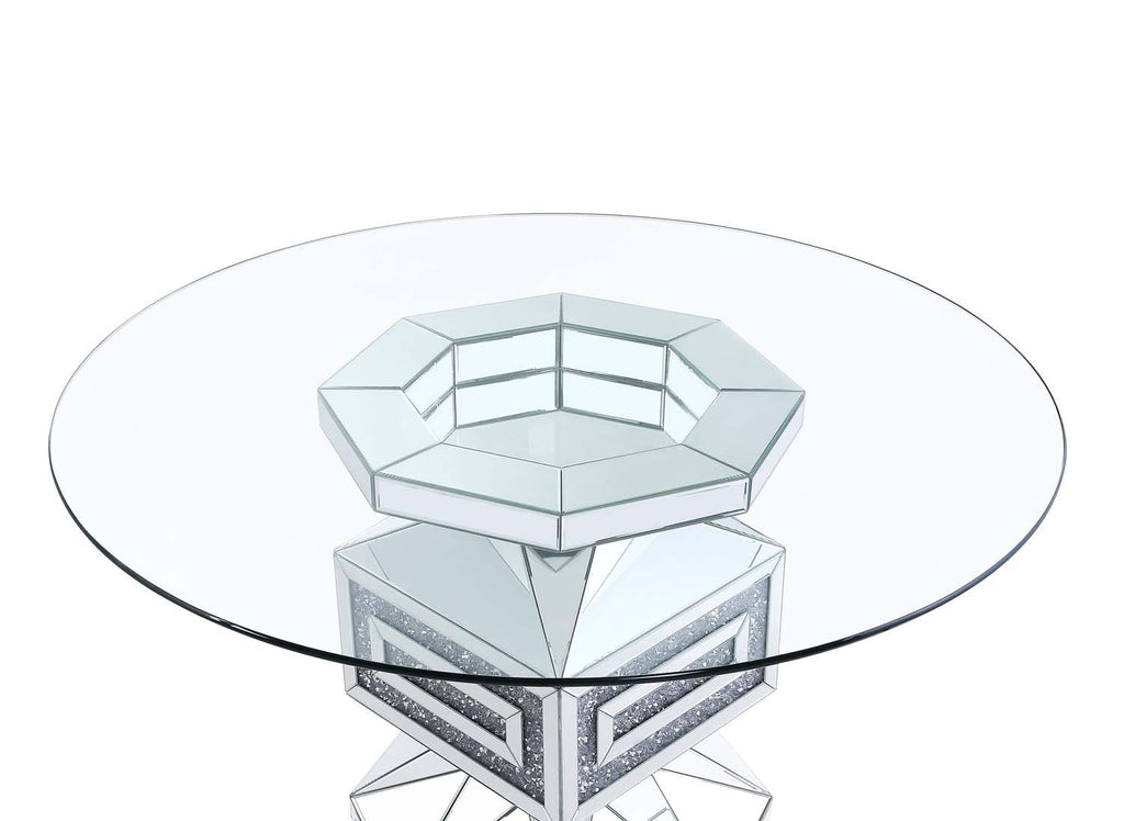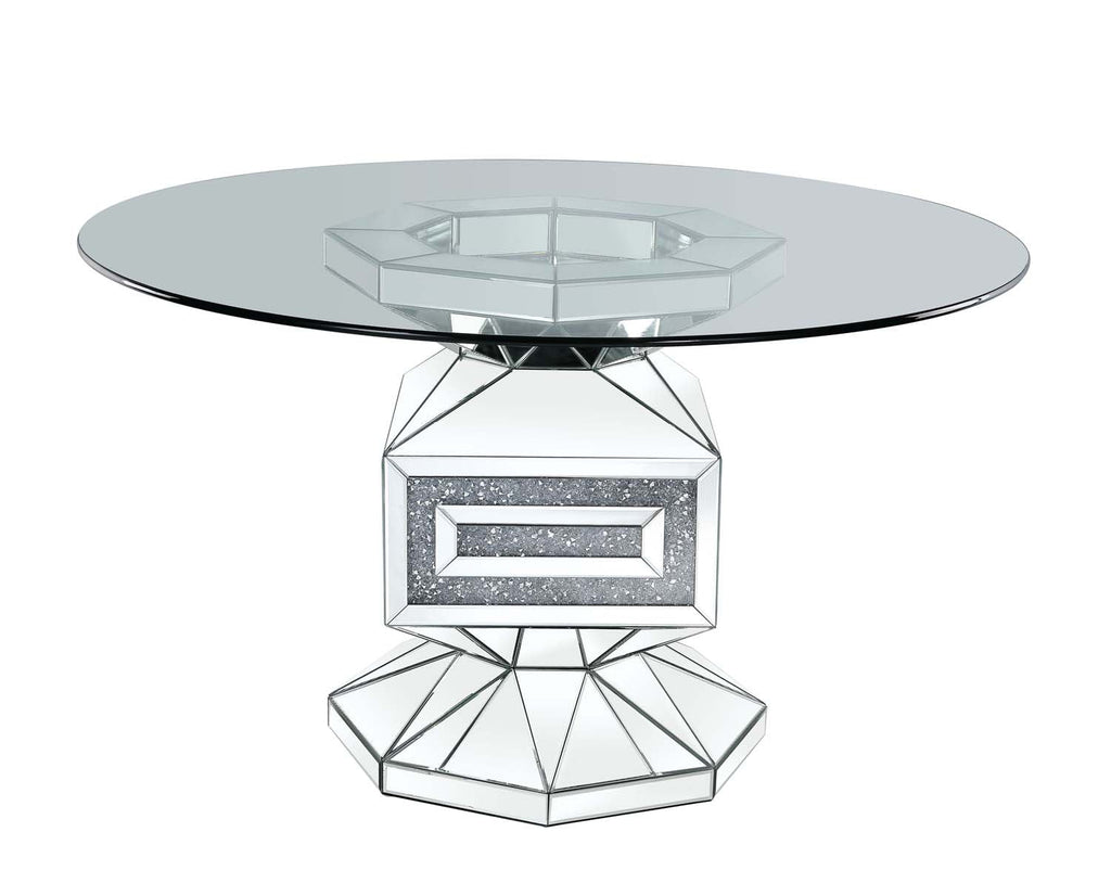 Shining as the center of your dining room, the Noralie Dining Table is accented by faux diamonds inlays and reflective surfaces. Light will filter through the glass tabletop to shine brightly throughout the whole dining table. Mirrored pedestal base features multi-facted design with geometric angle cuts, reflecting the light beautifully as well as the talking point of the room. The faux diamonds inlay adds unexpected beauty to the table. Bring a touch of modern glam and sophistication into your dining party with the Noralie Dining Table.