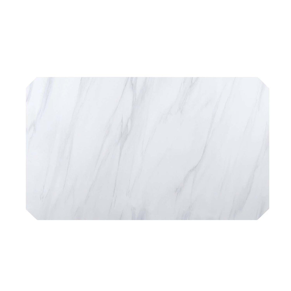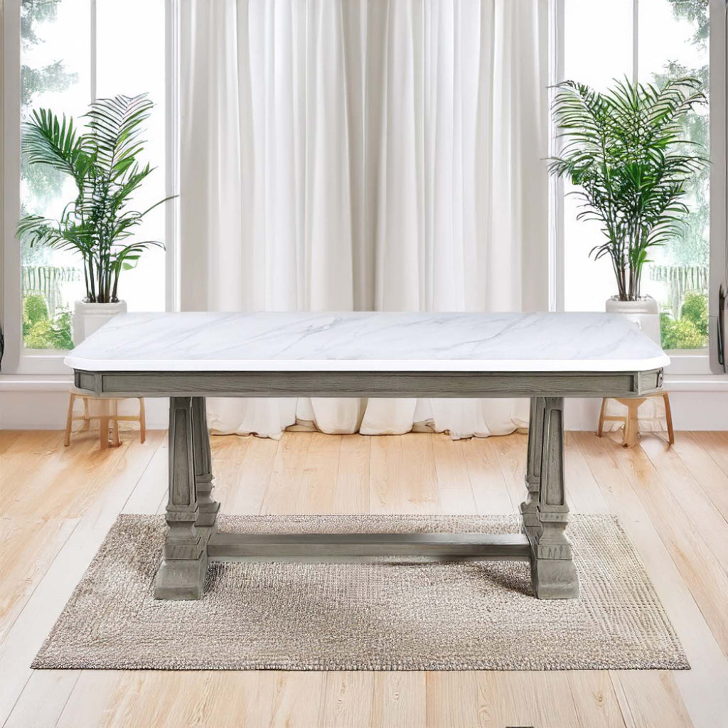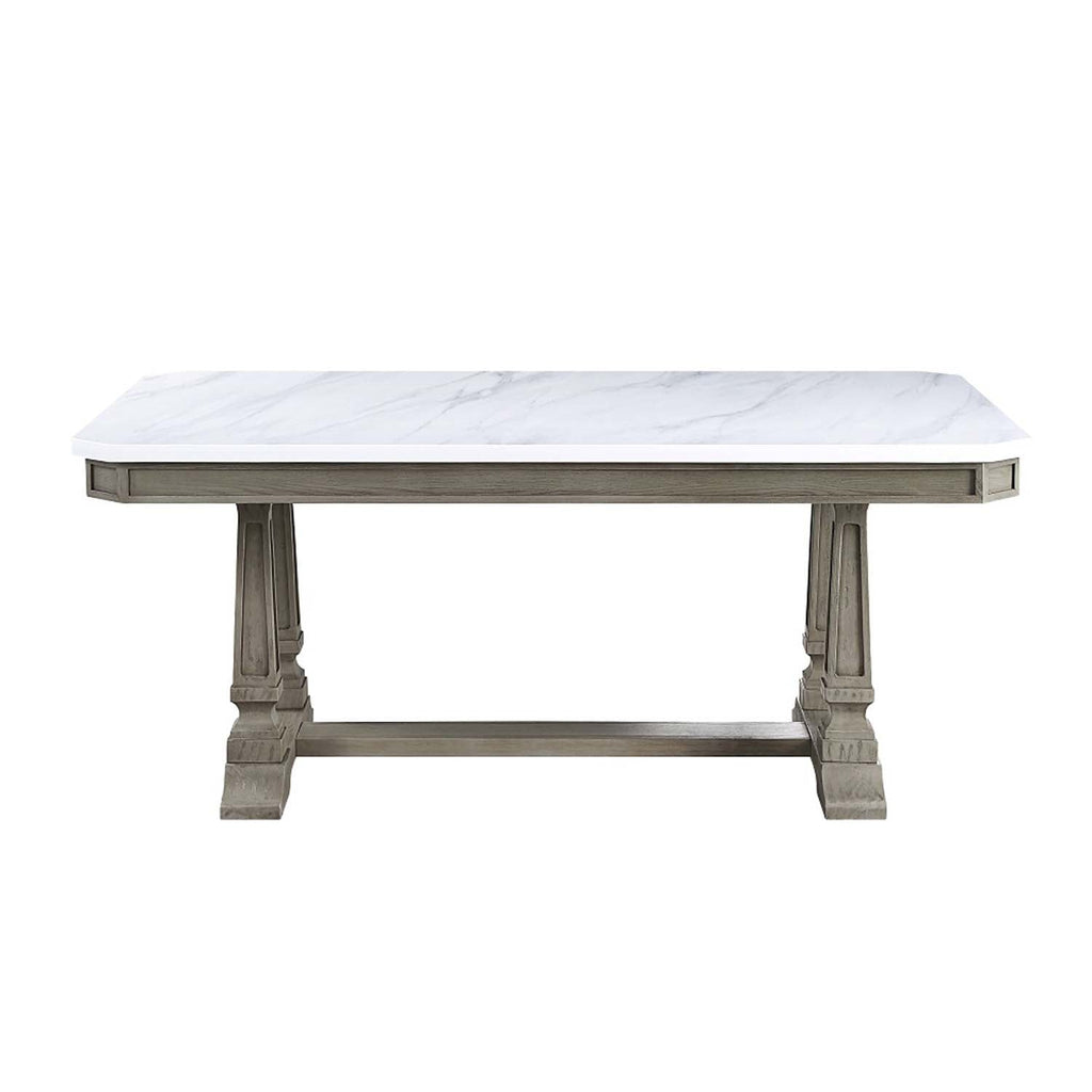 Style your dining room with an old world, vintage flair. The table combines white artificial marble top and weathered oak finish to create a subtle two-tone effect for a timeless and classic look. Angled corner edges and wood carved details add extra depth and texture to its overall aesthetic appearance. An elaborately carved trestle base under the tabletop offers a balance of grace and strength, providing elegant support to the rectangular tabletop. Your guests will feel warm and cozy in a traditional dining space the Zumala Dining Table creates.