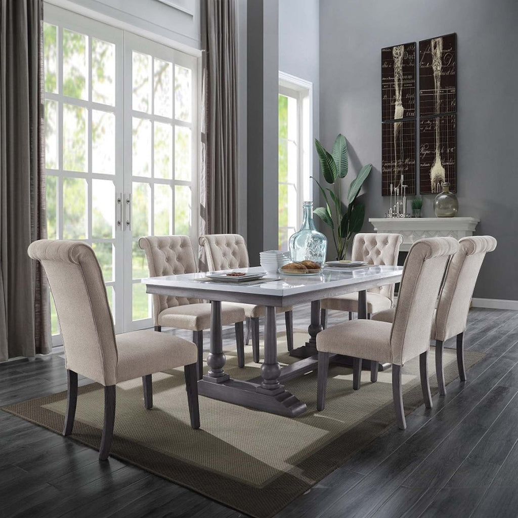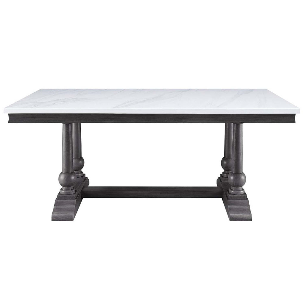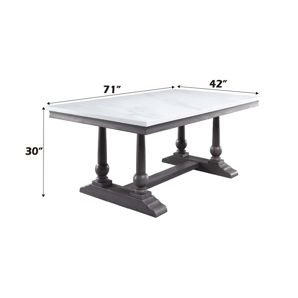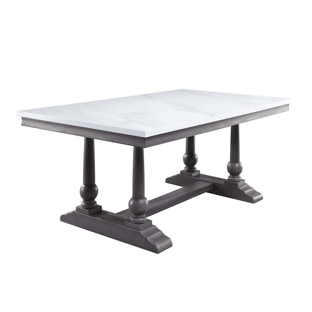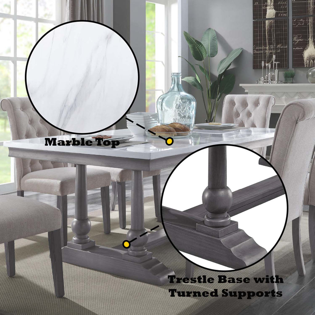 Gracefully crafted from wood in a muted, earthy gray oak finish, the dining table features a sturdy trestle base inspired by classical architecture aesthetic. White artificial marble top on the wooden frame creates a stunning two-tone design, providing timeless beauty. The rectangular dining table easily seats six people comfortably and allows your guests to enjoy their meals without feeling cramped.