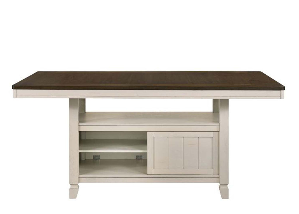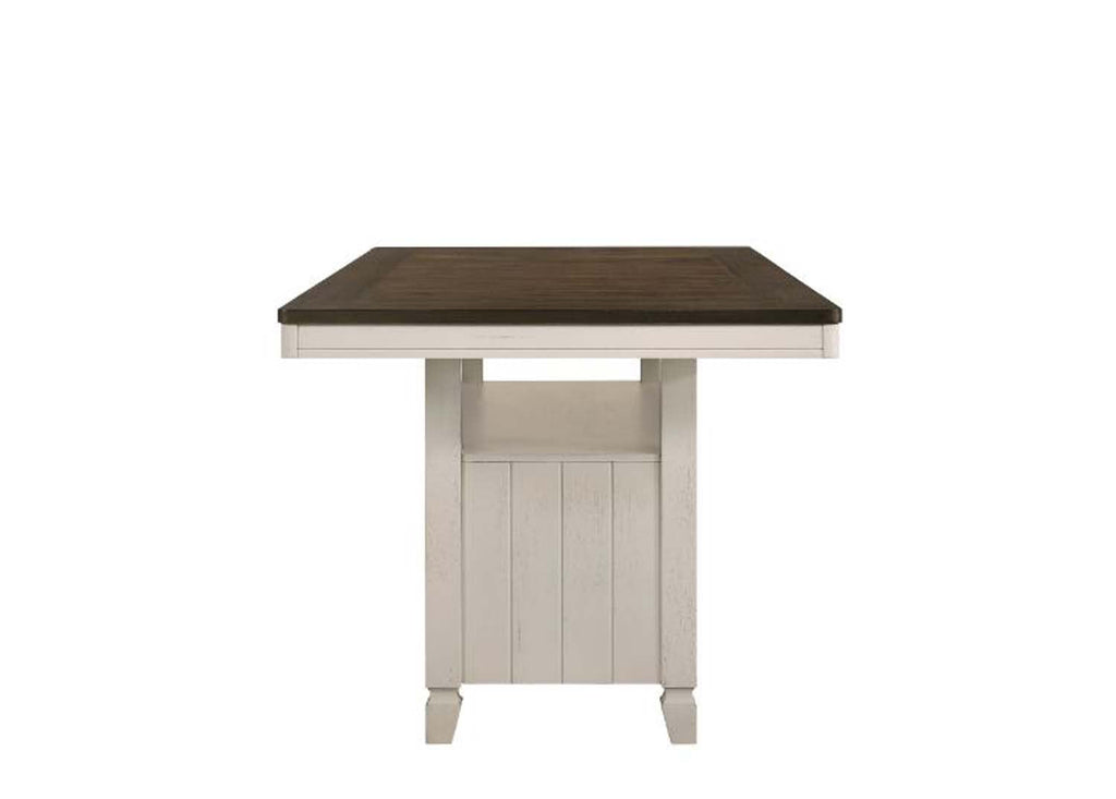 The Tasnim collection is multifunctional. The counter height dining table features an under-table storage cabinet for kitchenware. The built-in open shelves are the perfect solution for everyday and entertaining table use. The server offers built-in wine storage and spacious drawers ideal for storing linens and stemware. Pick the right seating for your dining room, the counter height chairs provide traditional slatted backrests, and the matching backless stool is padded with nail-head trim. Finished in an oak and antique white, creating the perfect contrast. With plenty of storage and the perfect balance of open and closed space, this Tasnim collection brings a whole new dimension to your dining space.