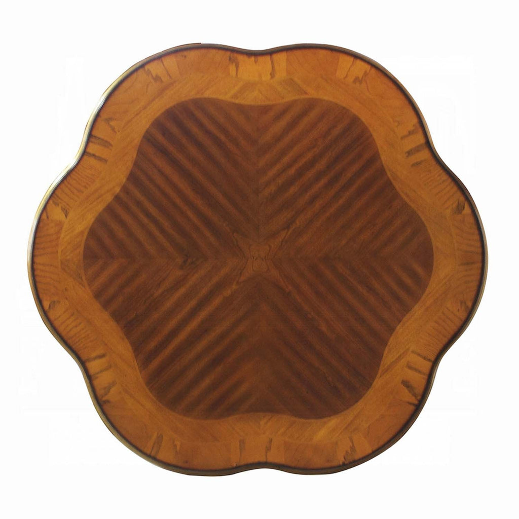 - Wooden Scalloped Top: Parquet Wood Veneer in Cherry Oak Finish, Wood Scrolled Apron with Floral Trim: Antique Pear Finish, (Rubberwood), Top: 4"H (25mm Thick, Apron 18mm Thick)
