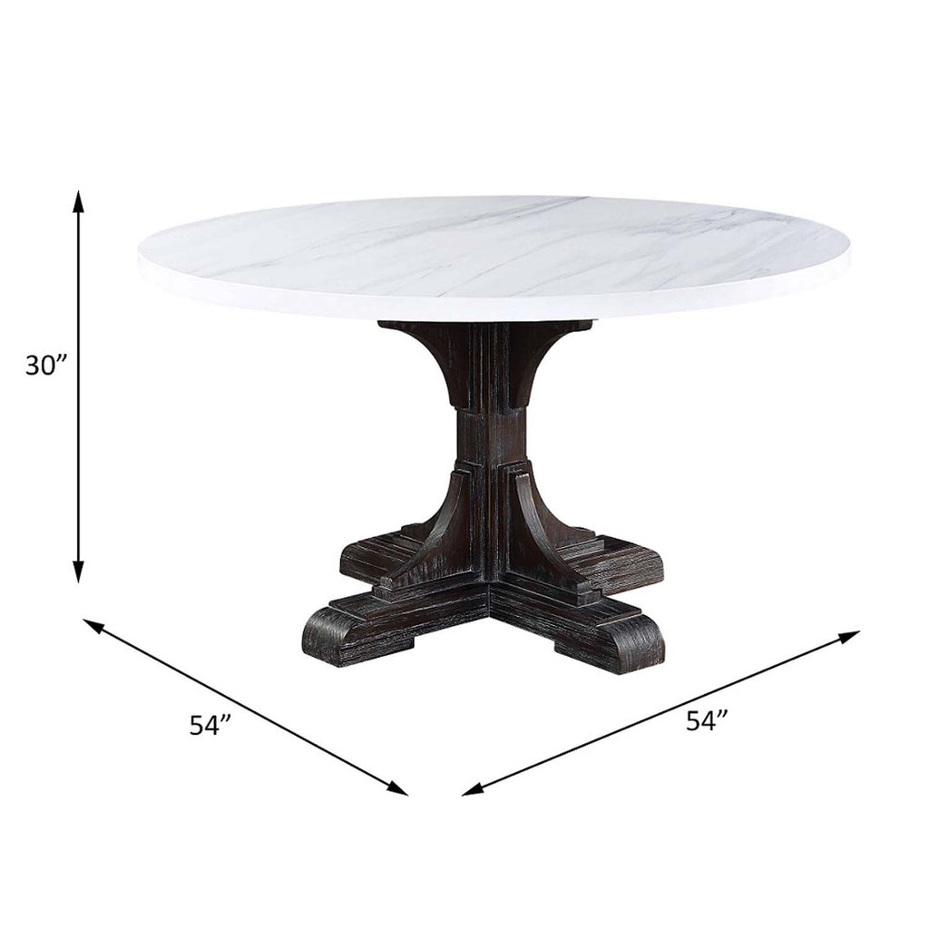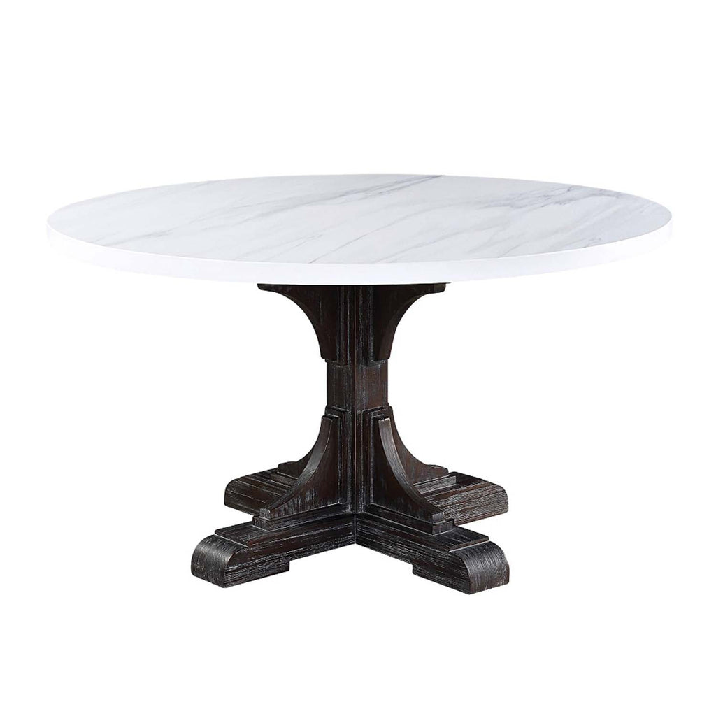 Warm wood tone paired with elegant white marble brings classic beauty into any ordinary space. The Gerardo Dining is founded atop wooden pedestal base in a weathered espresso finish, which showcases elaborate carving details on the base. White artificial marble top in a soft round shape design adds beautiful richness and depth to the table. Both practical and visually alluring, the dining table will instantly elevate the entire space.