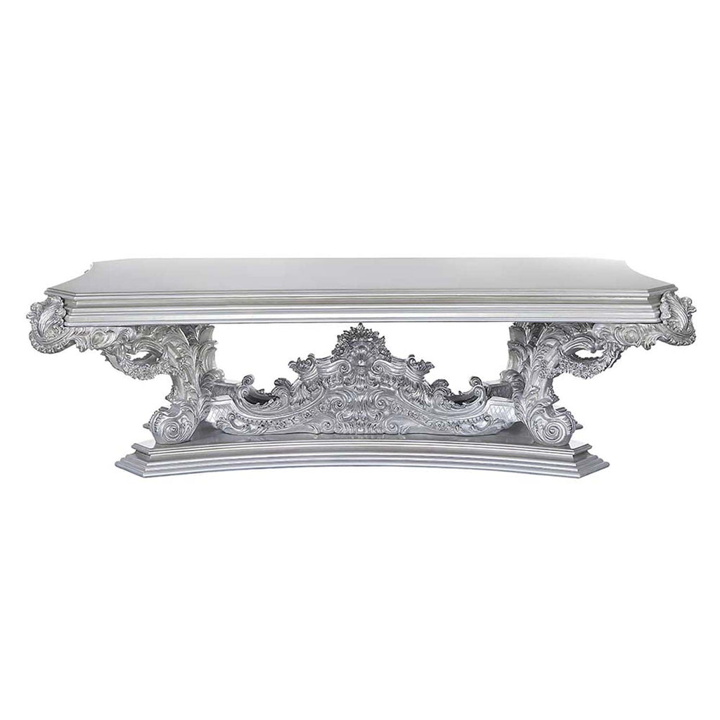 See the extravagant style and classical design all over the Valkyrie Dining Room Collection. Bold, intricate scrollwork accent is highlighted throughout each piece in this collection. Antique Platinum Finish paired with muted gray tone brings attention to its gorgeous details. Rectangular dining table showcases a timeless pedestal-style silhouette while matching chairs feature button-tufted upholstery for lavish comfort. Bring a dramatic change to your home with the Valkyrie Dining Room Collection.