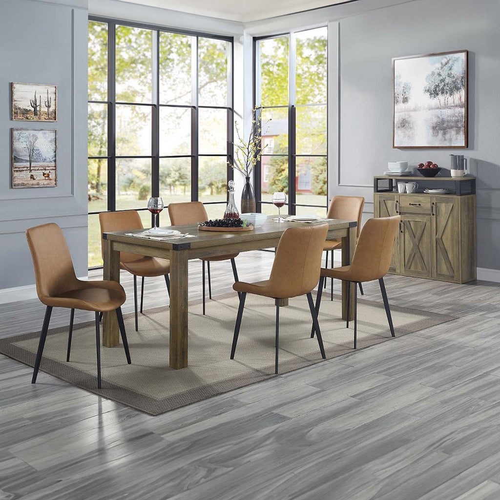 Designed in a Parsons-style silhouette, with harmonious and clean, square lines, the Abiram dining table also boasts small-space sensibility. The generous surface, yet slimmer frame of this table lets it double as a dining table or versatile work-from-home space. It features a distressed-wooden effect on the tabletop and offers decorative metal corner protectors.