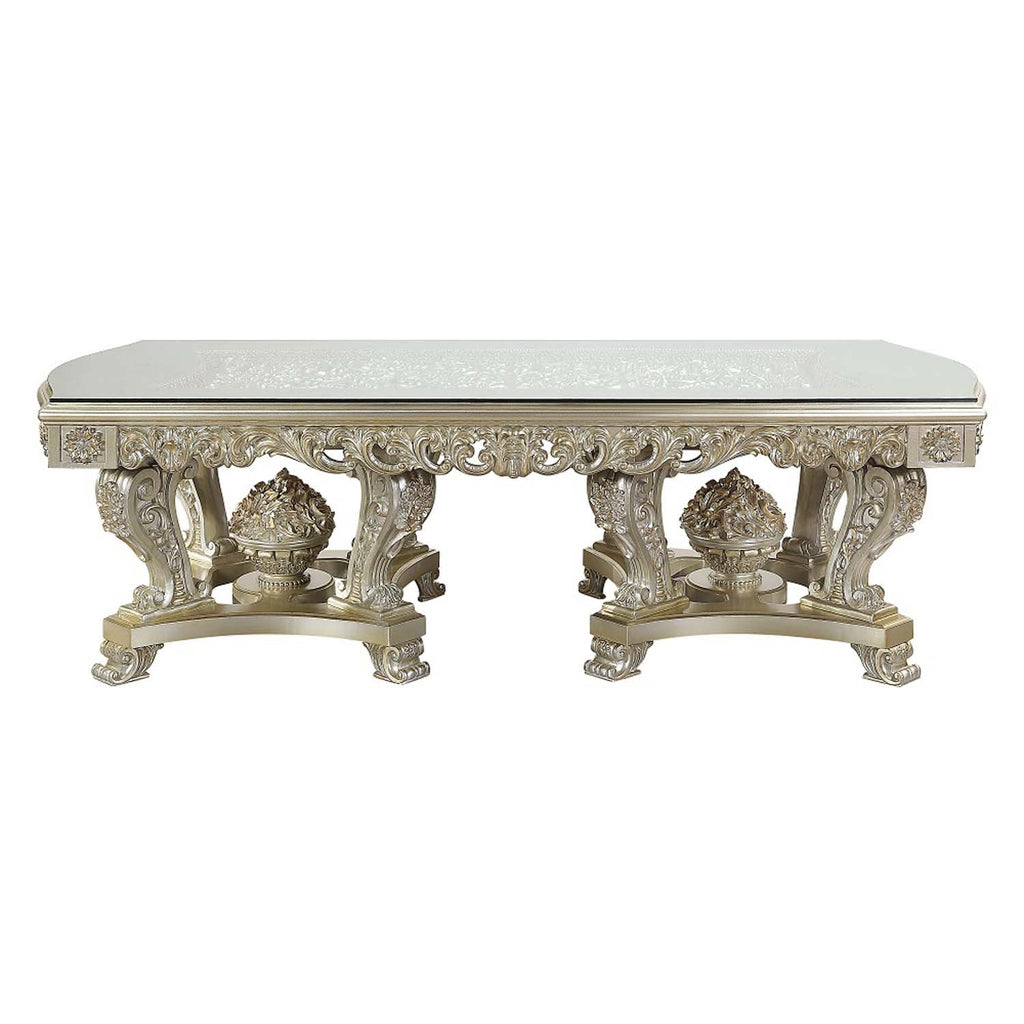 Opulent and magnificent the Sornia dining table will be the focal point of any dining room and is sure to wow guests. The clear glass tabletop allows for the fine details to be enjoyed while dining and will be the topic of conversation throughout the night. The large size is excellent for hosting larger gatherings.