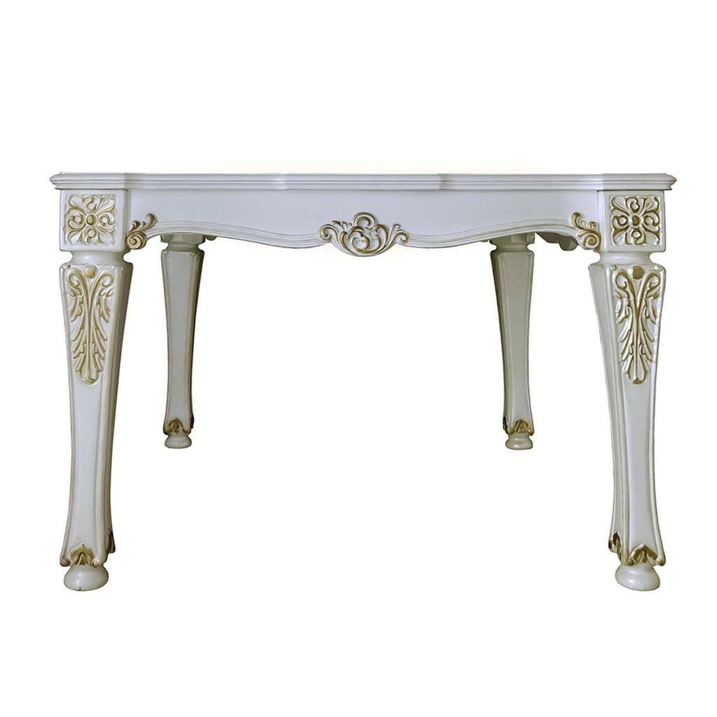 The Vendome counter height dining table looks like it is right out of a Regency photograph. This counter-height table is in an antique pearl finish with hand-painted golden paint. The gold paint will help to accentuate the delicate fine details. The table features a decorated apron and legs that give it a classic regal aspect.