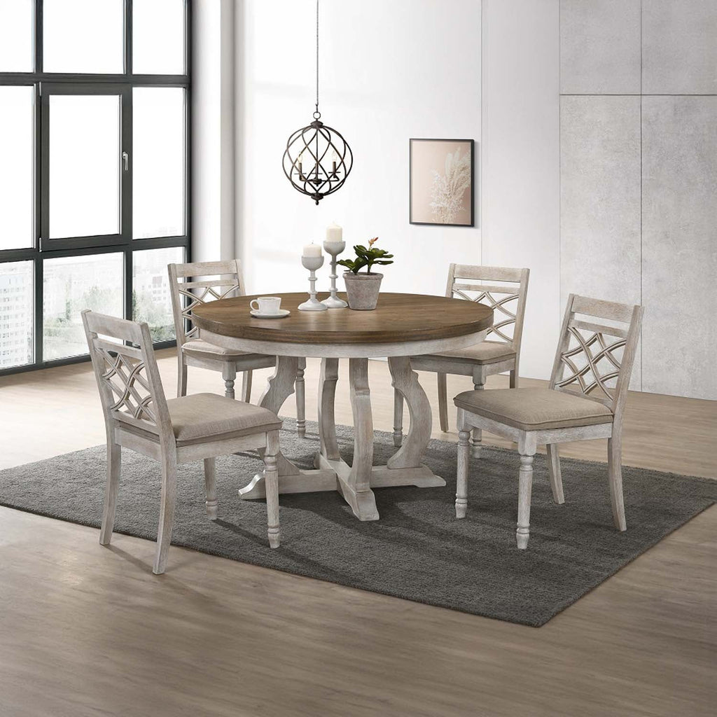 Timeless and charming, this Cillin round dining table lends a cottage chic vibe with an antique white finish frame and pedestal base. Pair this table alongside French country decor in a rustic-style dining room to add some bright cheerfulness. Additionally, this table offers a weathered oak tabletop. This Cillin dining table creates a cozy environment where you and your guests can enjoy many hours of good conversation and delicious meals.