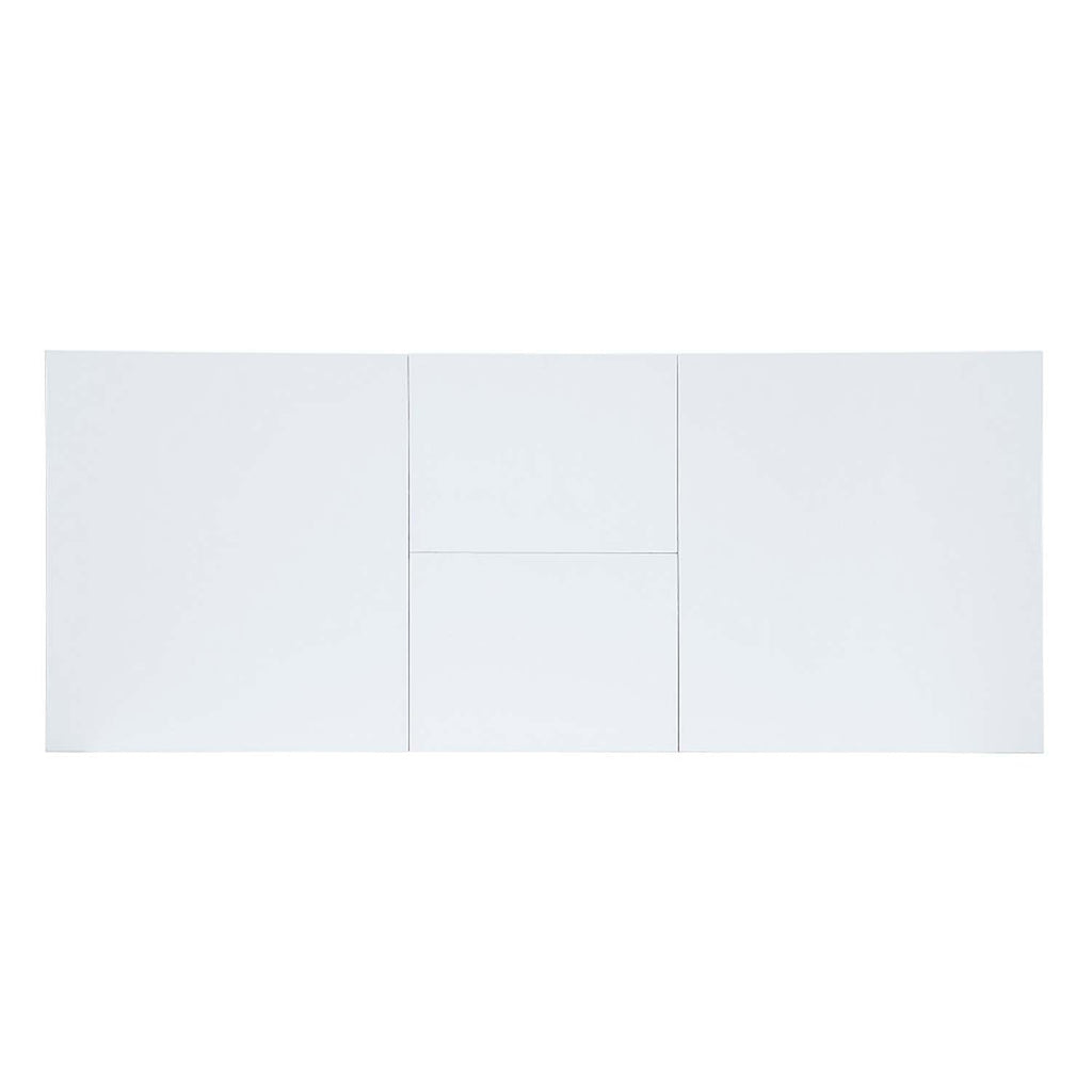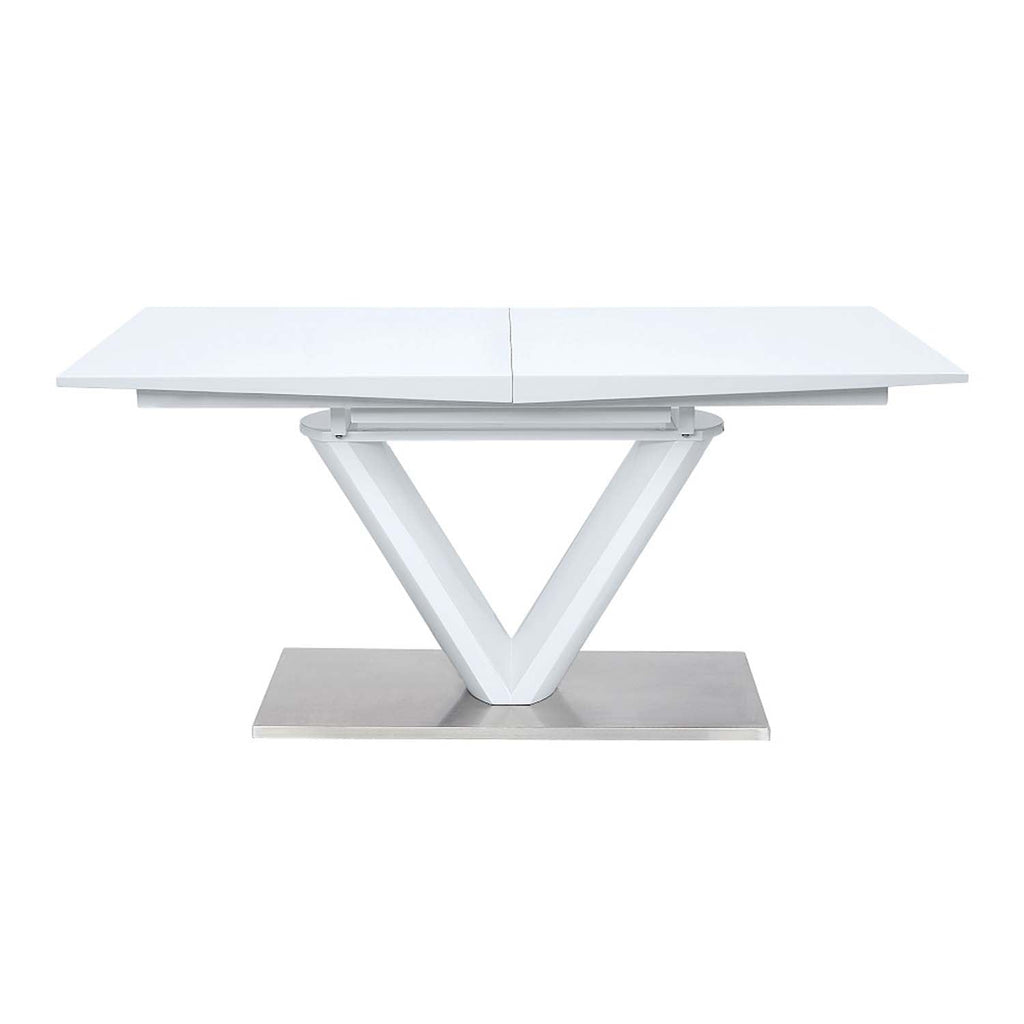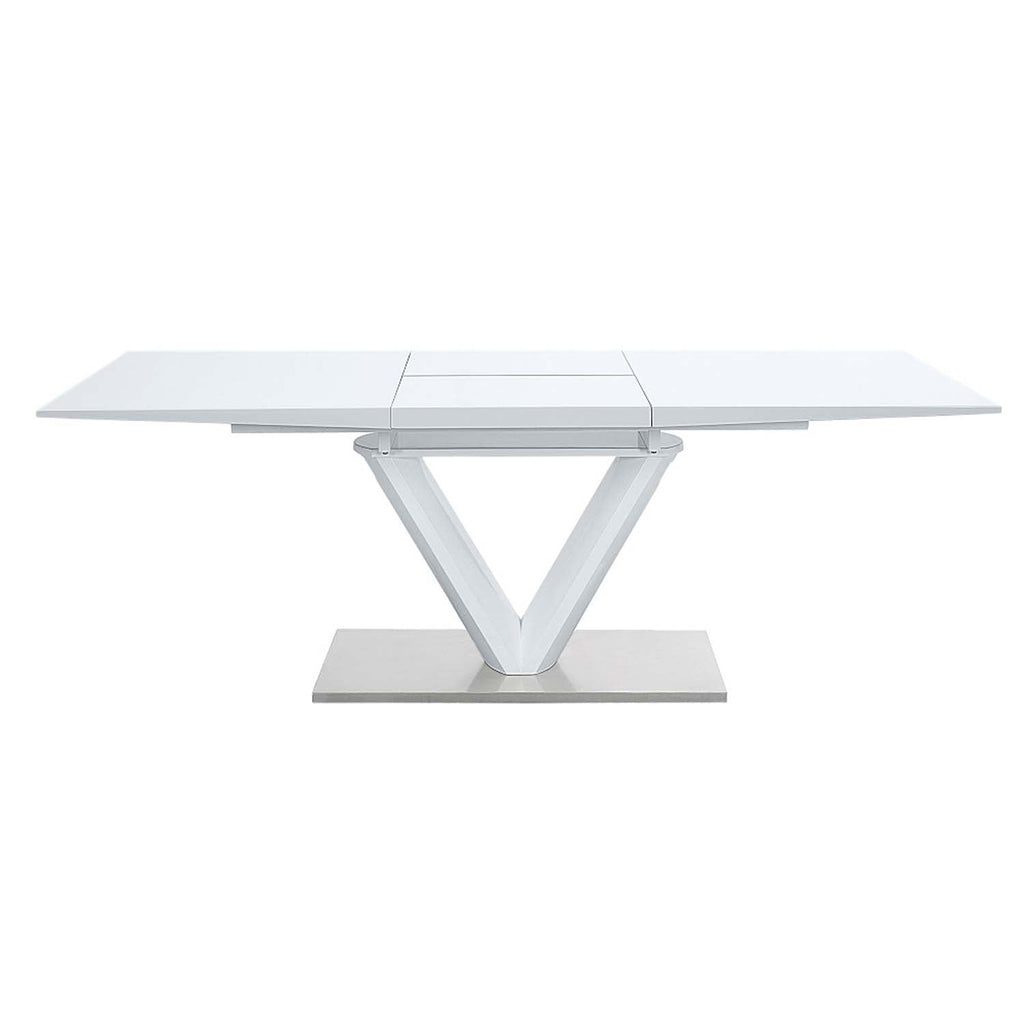 This Gallegos dining table adds a modern silhouette and a mix of glam materials to your dining room. It's crafted from a blend of engineered wood and stainless steel, and it showcases a shiny finish that's sure to make a style statement in your home. This table is built on a pedestal base with a V-shape design for an airy open look. The rectangular tabletop is finished in high-gloss white for an elegant look that is also easy to clean. This dining table is ideal for seating up to eight people with its butterfly extension leaf.
