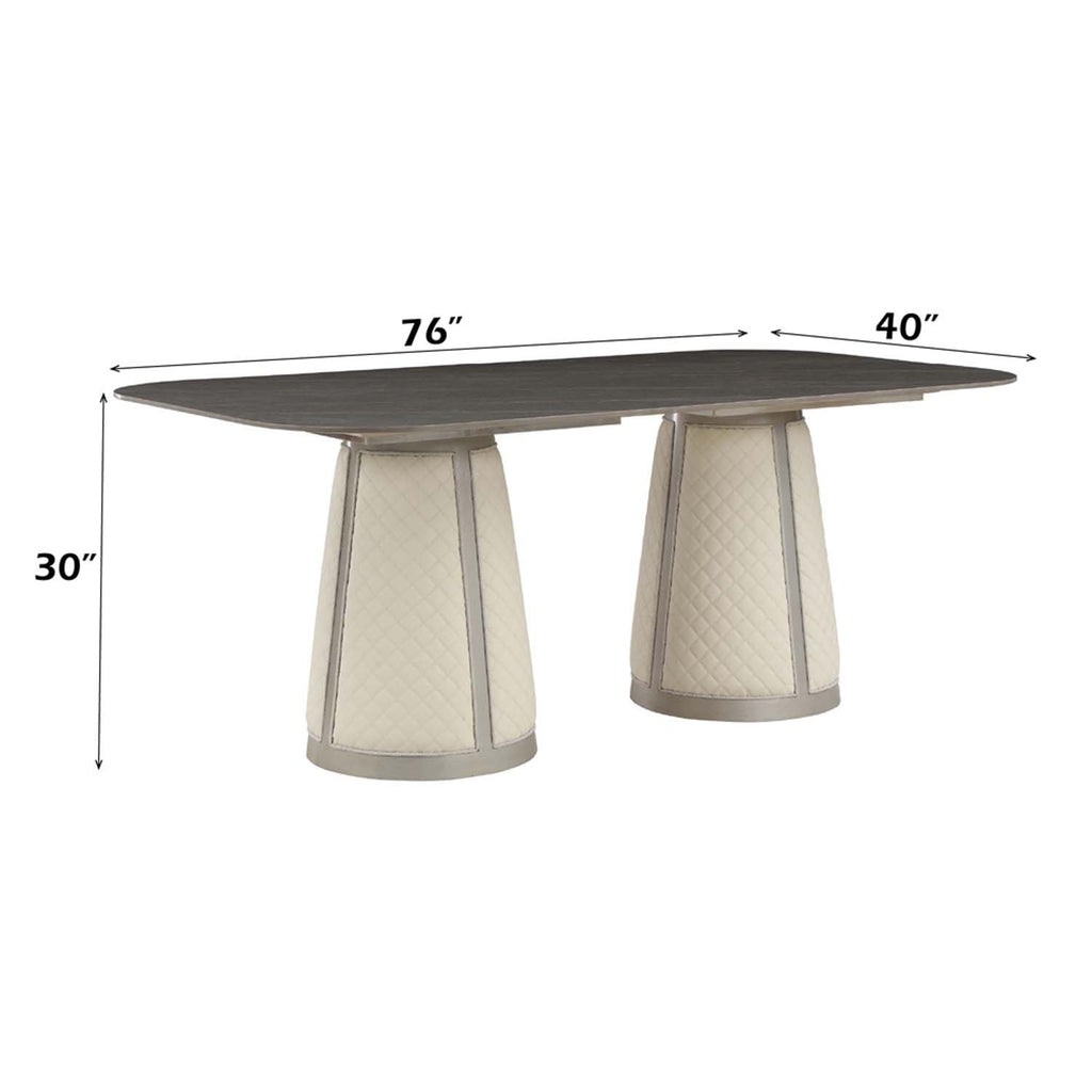 Gather friends and family around the Elyssa dining table. This dining table features a double pedestal base and a smooth sintered-stone rounded-edge tabletop. The pedestals are lightly padded, and diamond quilted with synthetic leather. It is finished in a champagne color that adds a stylish touch. The stone tabletop showcases a beautiful variation of veins for a subtle contrast. Comfortably accommodates eight people.