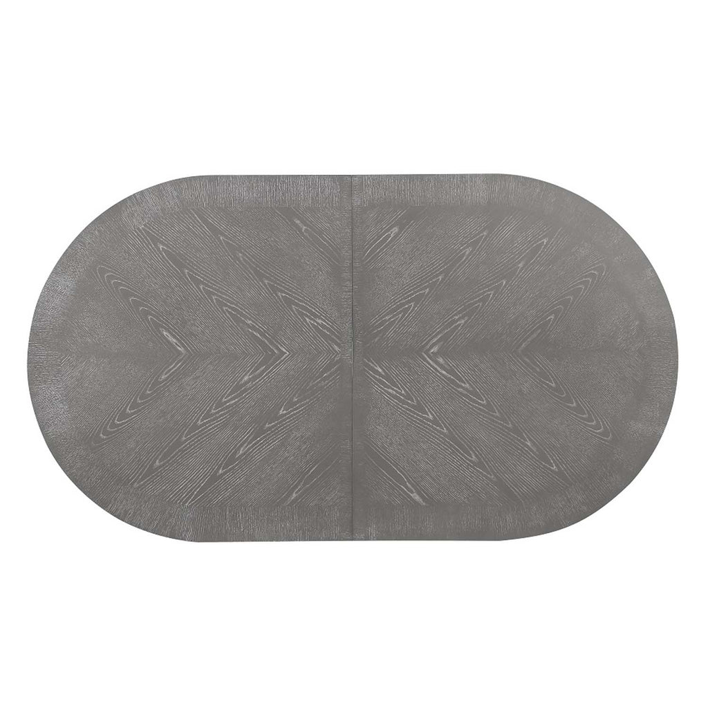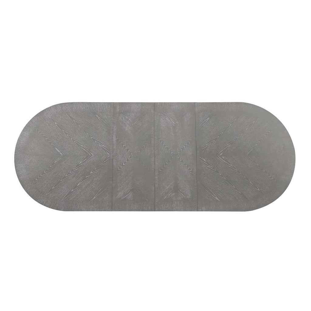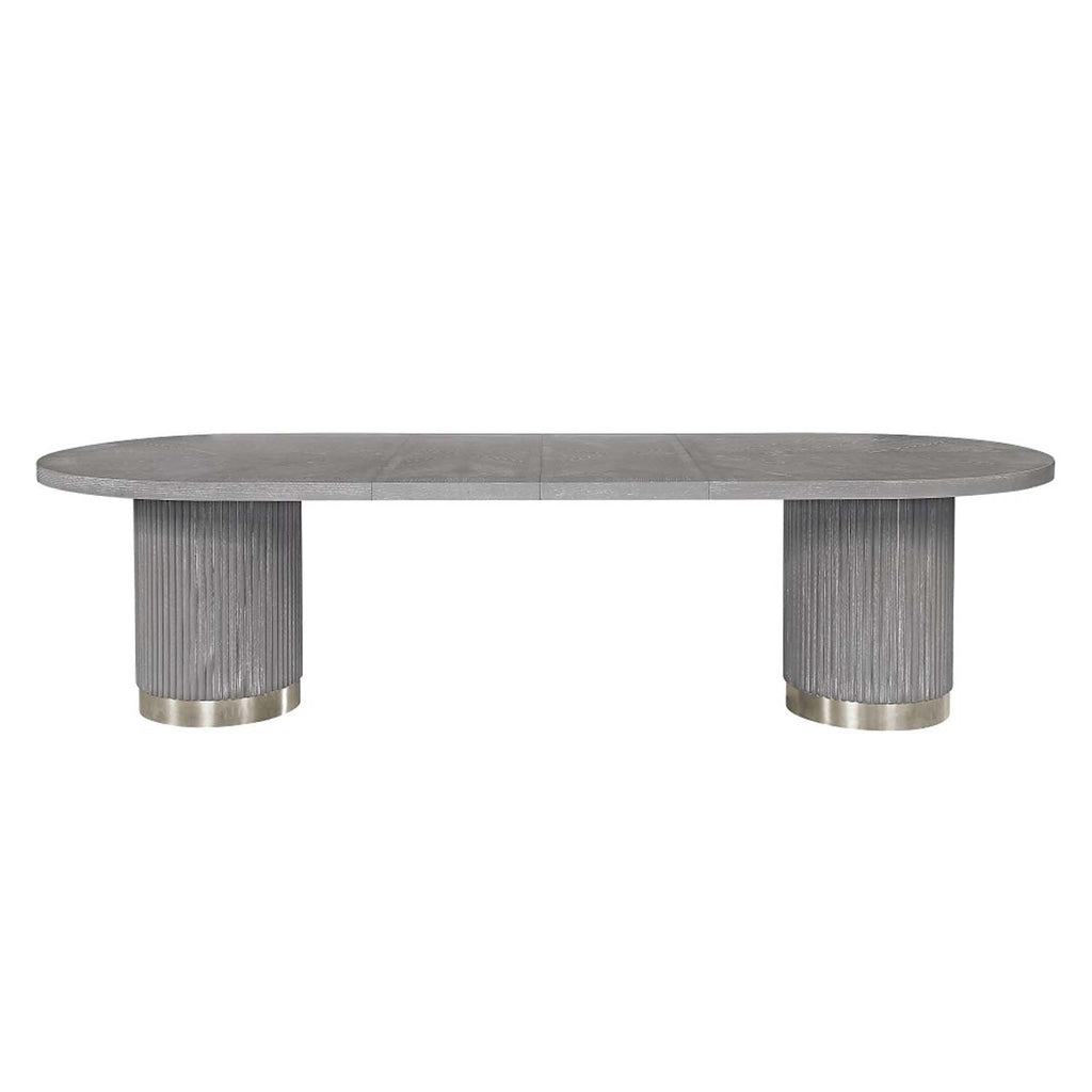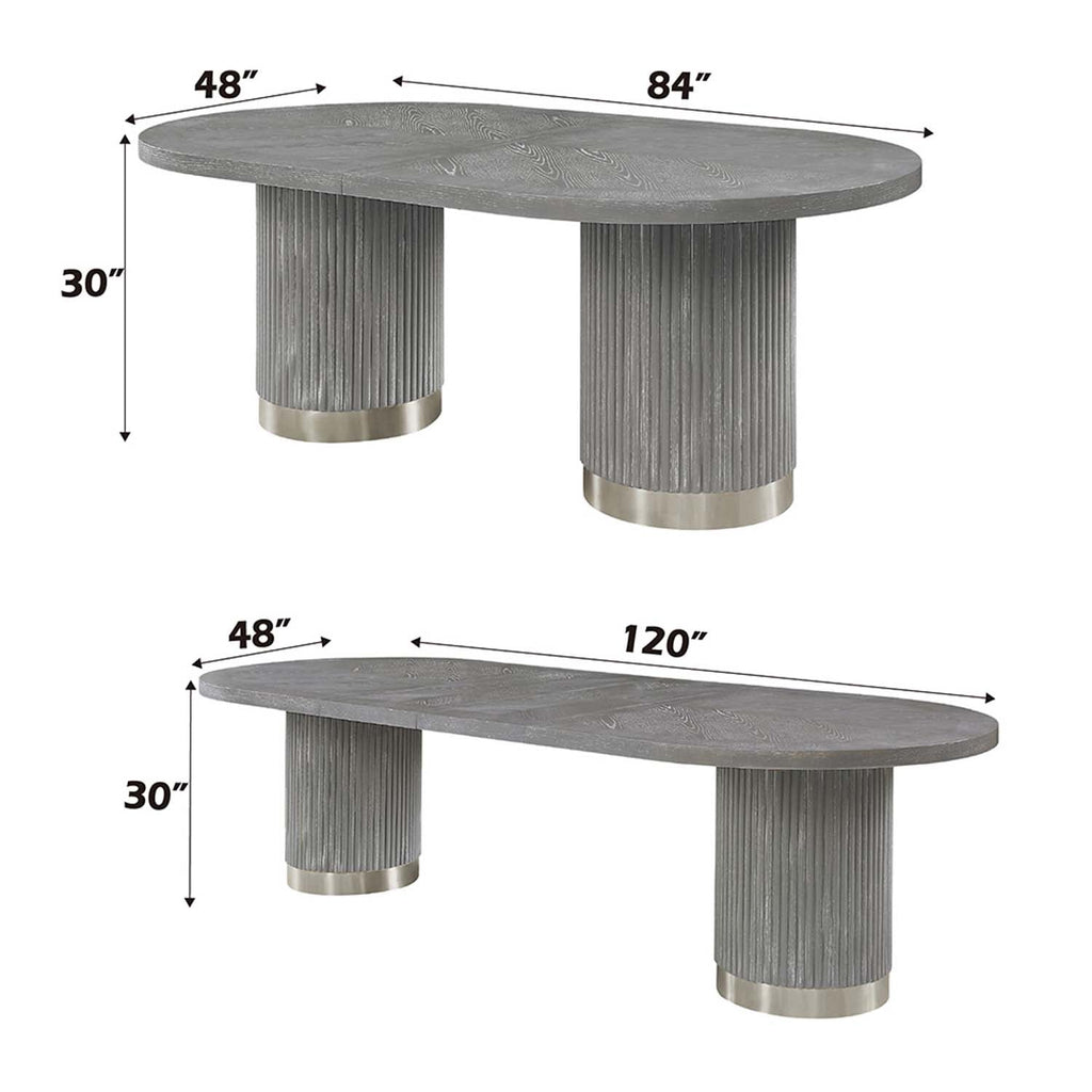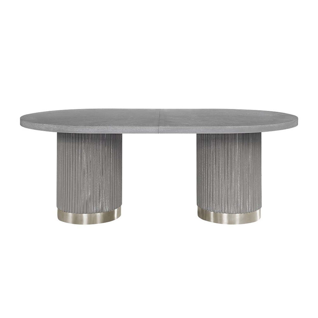 This Adalynn dining table brings a sleek, spacious surface to your dining room. This table stands on a double pillar base with silver metal tips for a stylish touch. Finished in a weathered gray oak that showcases a tabletop with light wooden grains. This table features a textured oval surface with rounded corners for a sculptural silhouette. Adding to the overall allure of the design gives the piece a modern flare.