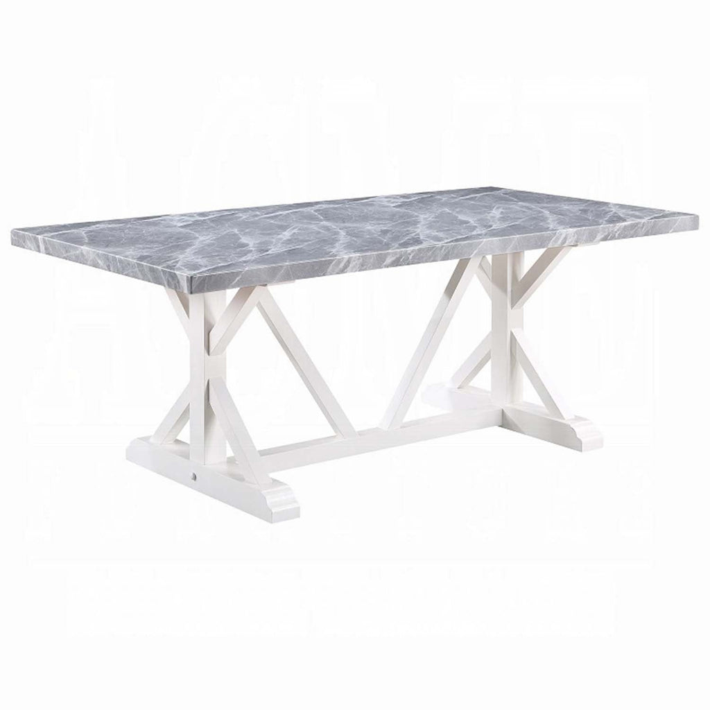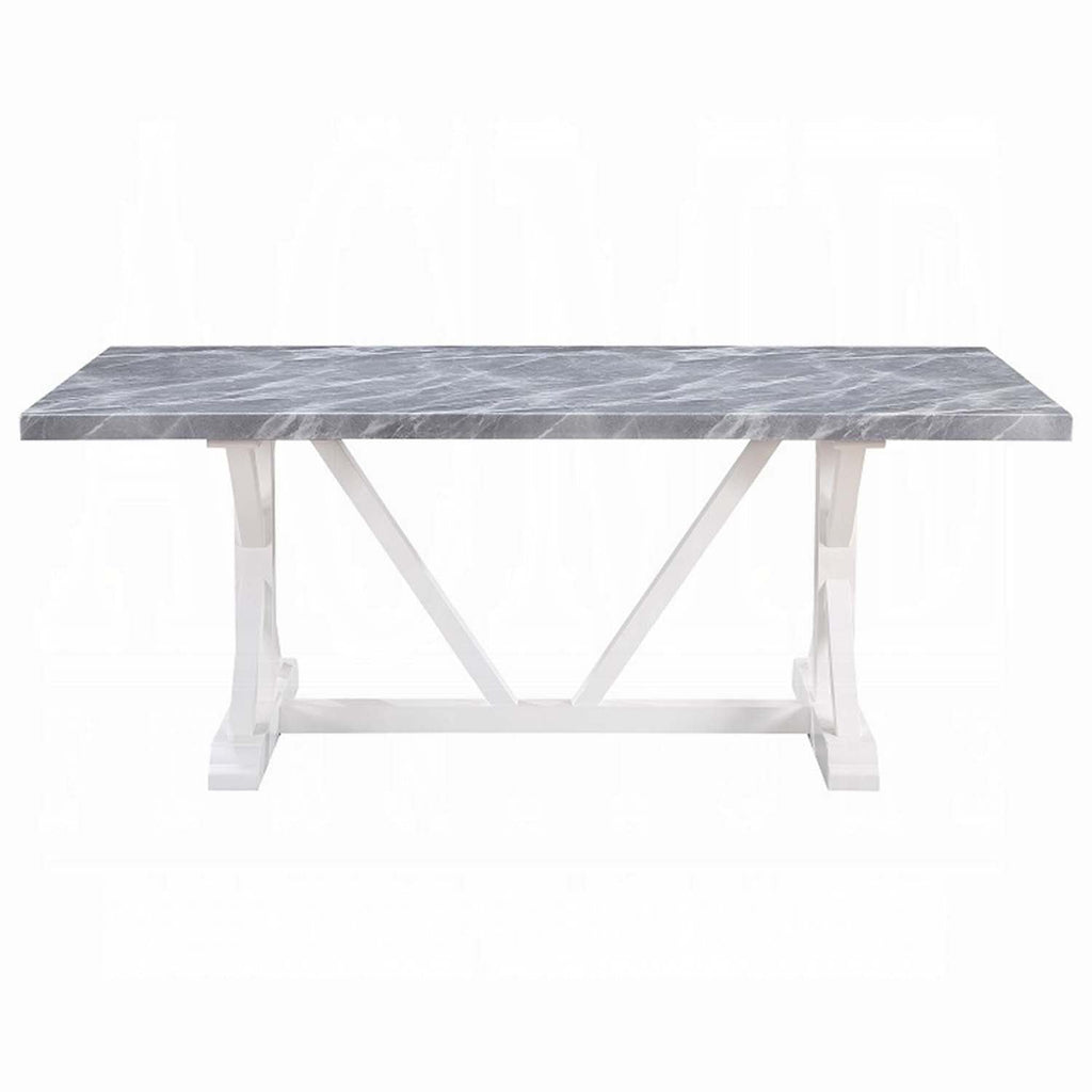 This Hollyn luxe dining table is topped with black engineered stone for a glam look and a classic feel. Founded on a wooden base, this table seats up to six people, so everyone at your dinner party has a seat. It features a rectangular top in a classic gray color with white veins, balanced on a cross-legged trestle base in a white finish giving this piece an elevated farmhouse feel. At 78'' long, this table works well in larger dining rooms or kitchens.