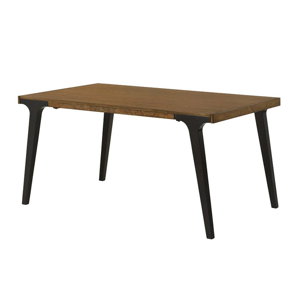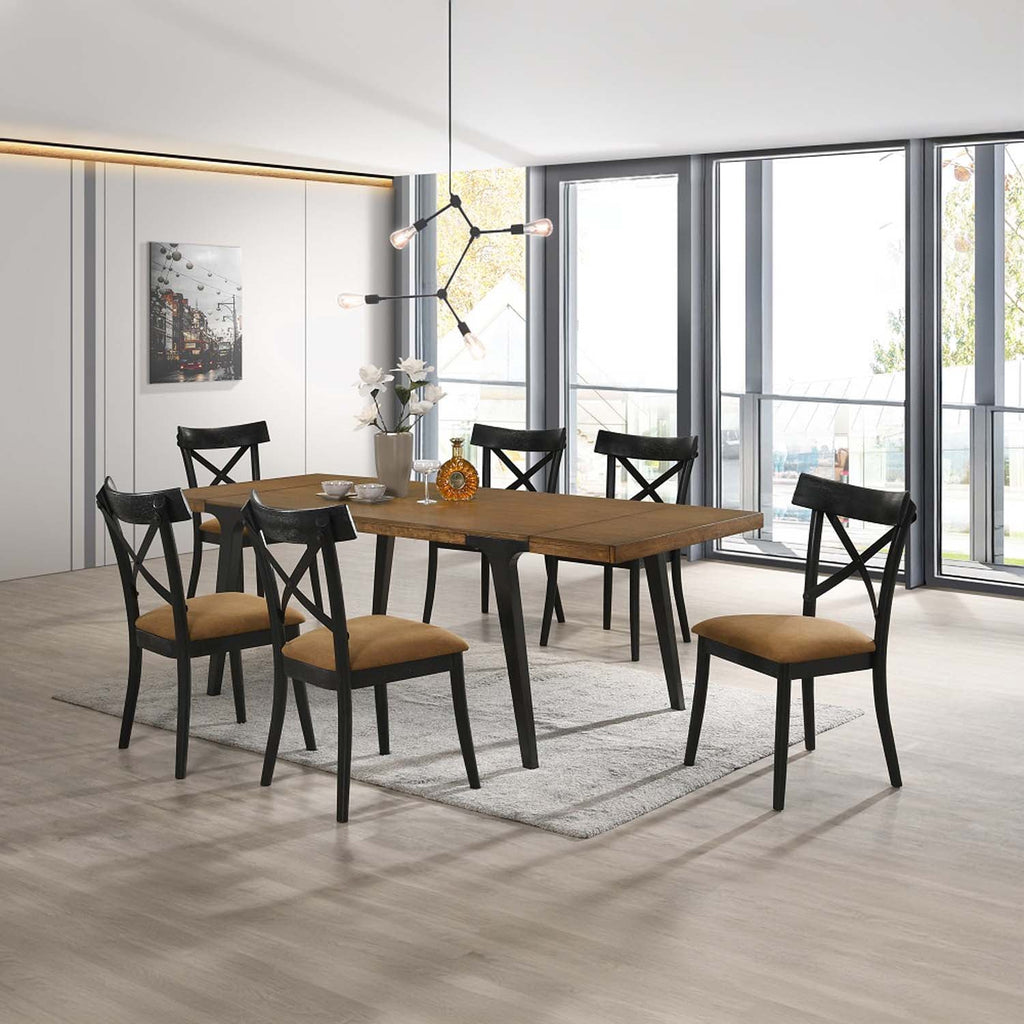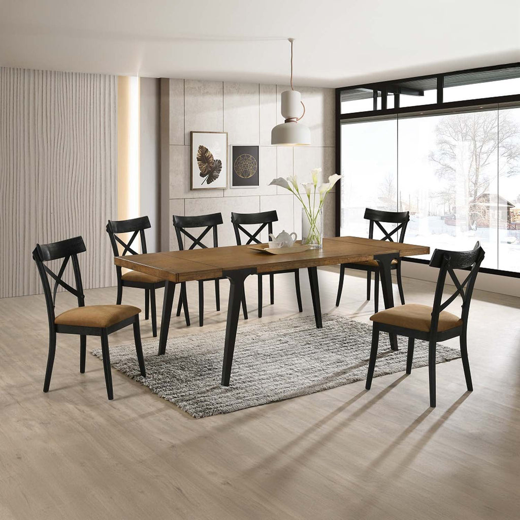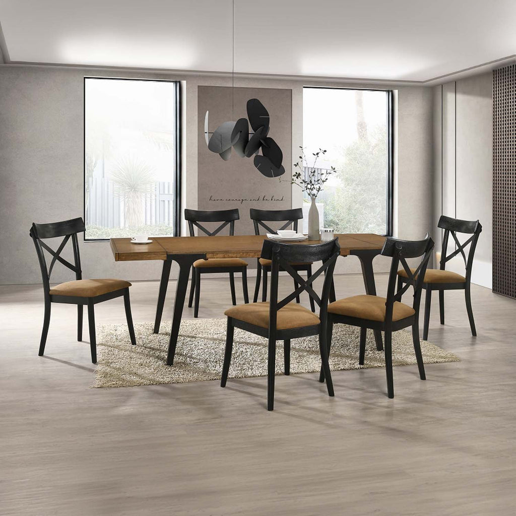 This Hillary sculptural dining set juxtaposes rustic a walnut wooden finish against bold black wooden legs for a modern take on an industrial-inspired style. The clean-lined proportions and black finish of its angled wooden legs add a striking contrast to the thick butcher block design of the rectangle table. The high-quality walnut finish wood grain laminate highlights its natural features and complements almost any color palette. Crafted from high-quality manufactured wood, the dining table is a beautiful place to gather with your family and friends for dinner, celebrations, and game nights! There's plenty of room on the surface to accommodate up to six guests with its two extension leaves for a casual weeknight meal or holiday dinner.