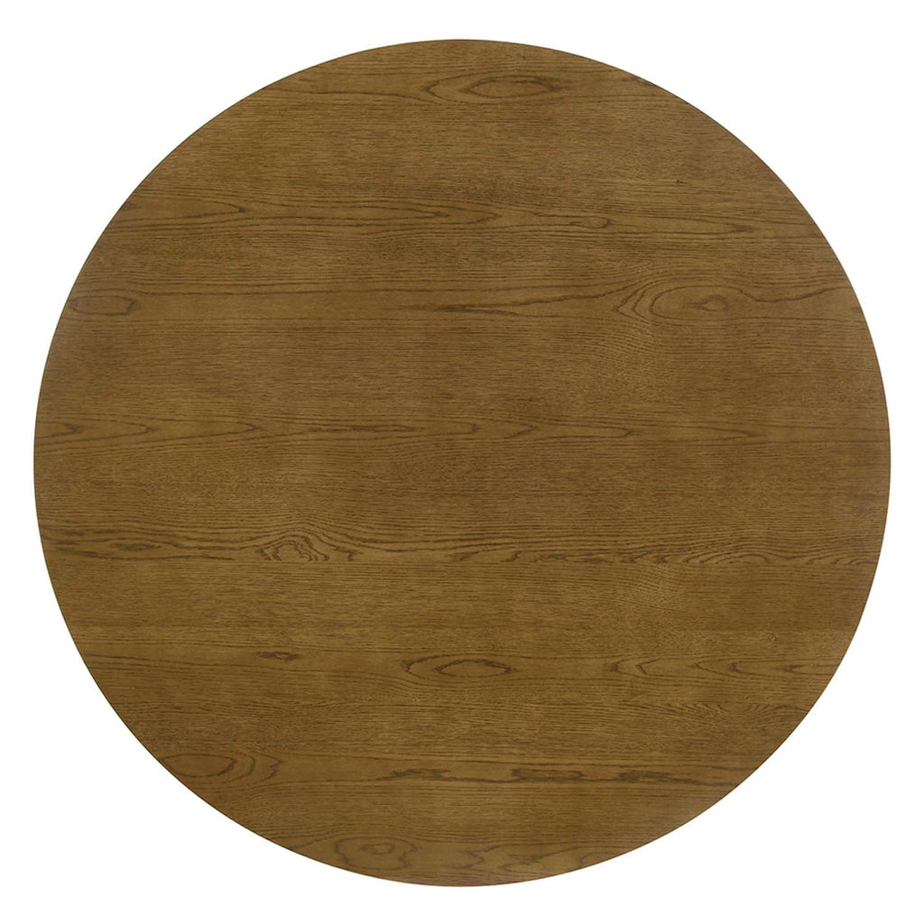 This round dining table exudes modern elegance with its rich walnut finish and sophisticated design. The single pedestal base features vertical striations, adding a touch of texture and visual interest. Hezrai perfect for intimate dinners and family gatherings, this table combines style and functionality, making it a stunning centerpiece for any dining space. Enhance your home with this exquisite table, where contemporary design meets timeless charm.