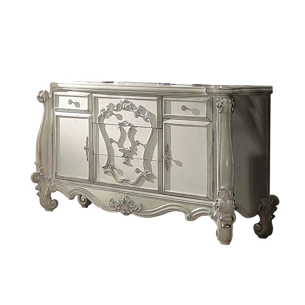 The Versailles dresser is the perfect accent to create the style of royalty your bedroom has been needing. This dresser crafted in wood with bone white finish was inspired by old European design with brown copper metal hardware and intricate wood carvings on the front of the five drawers and two doors.