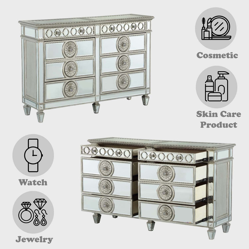 The Varian dresser provides a commanding presence in any room. Add a dash of glam to your bedroom with this Varian dresser, this dresser features four tapered legs and 8 storage drawers with crystal-like knobs. This gorgeous dresser is accented with raised geometric patterns and mirror finish. This fashionable dresser will fuse with the surrounding Decor, transforming a room from ordinary into something interesting and sophisticated.