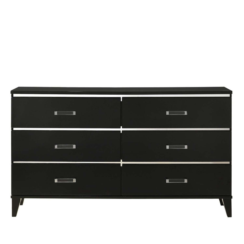 Explore modern simplicity that easily improve your overall aesthetic. The contemporary lines of this dresser works perfectly with the temping finish, while decorative sliver trims add depth and reflect light. It offers six storage drawers with clear acrylic bar handles that bring a voguish, high-end feel to the piece. Simple design with clean lines let this chest can work well in rooms of all styles.