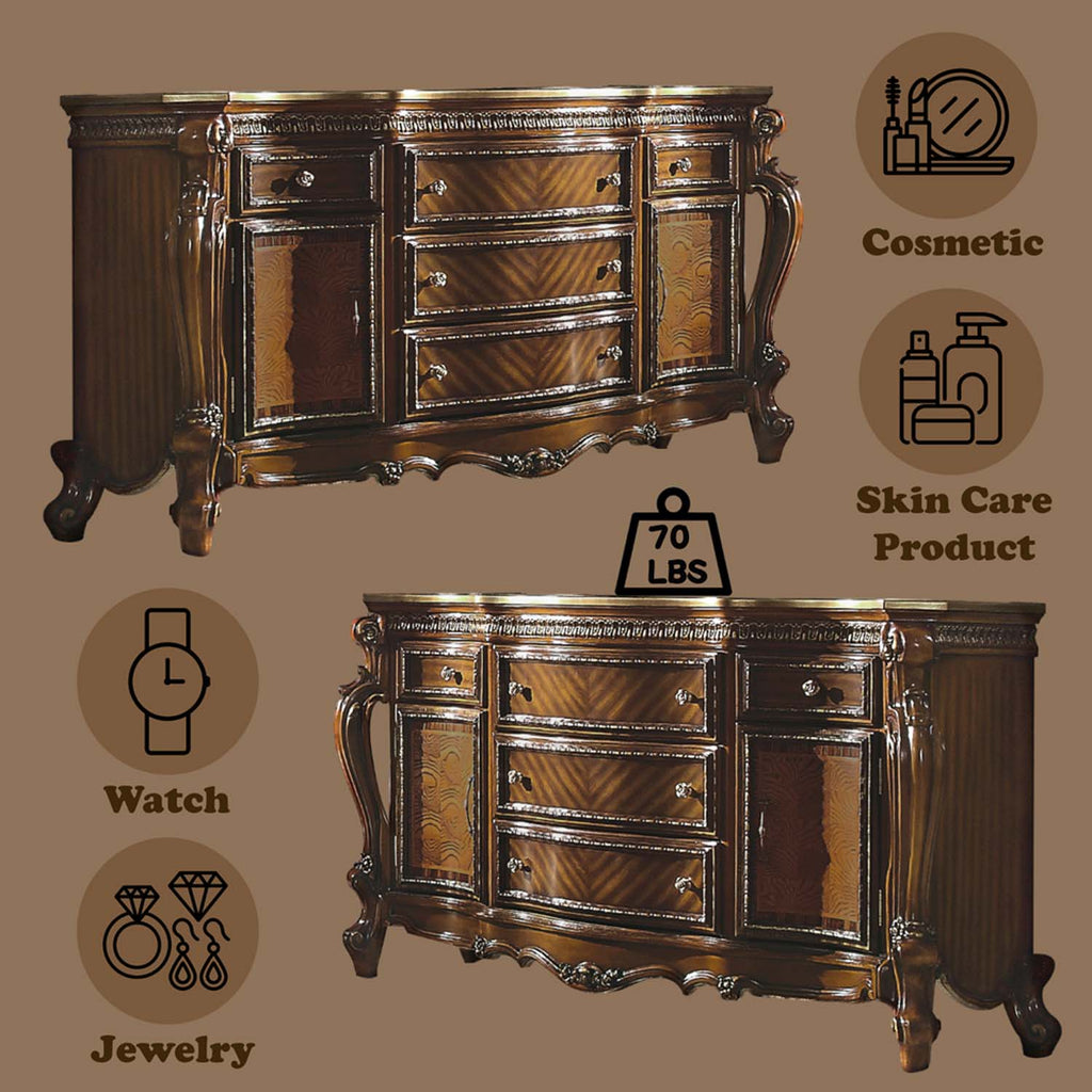 - Casegood: Bow-Front, Same Finish Top, Oversized Scrolled Leg and Base (Front Drawers with Raised Scrolled Trim): Poly Resin with Antique Contrast Finish