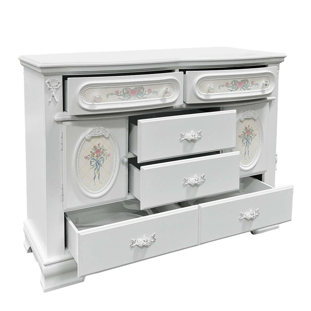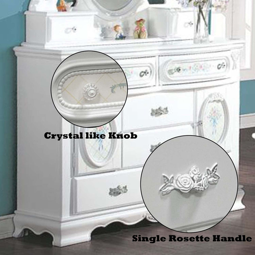 The Flora dresser features beautiful floral motif decals, rope moldings on the drawer fronts, and decorative profiled crown molding on all cases. Providing a much-needed storage solution for all your little one's clothing, dress-up accessories, and toys with its six ample drawers and two side compartments. This beautiful Flora dresser is the perfect storage solution for your favorite princess room.