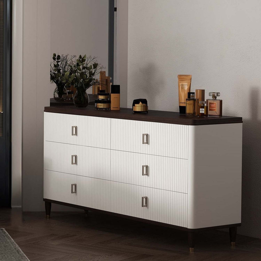 The Carena dresser is the perfect blend of timeless design and modern functionality. This dresser is crafted with care to enhance your bedroom's style and comfort. The white and brown finish exudes an understated elegance, creating an inviting atmosphere. The slatted drawer fronts of this piece provide visual appeal, while the six drawers add function to your bedroom. The tapered legs with metal tips add a touch of sophistication and durability. Perfect for anyone who values style and functionality.