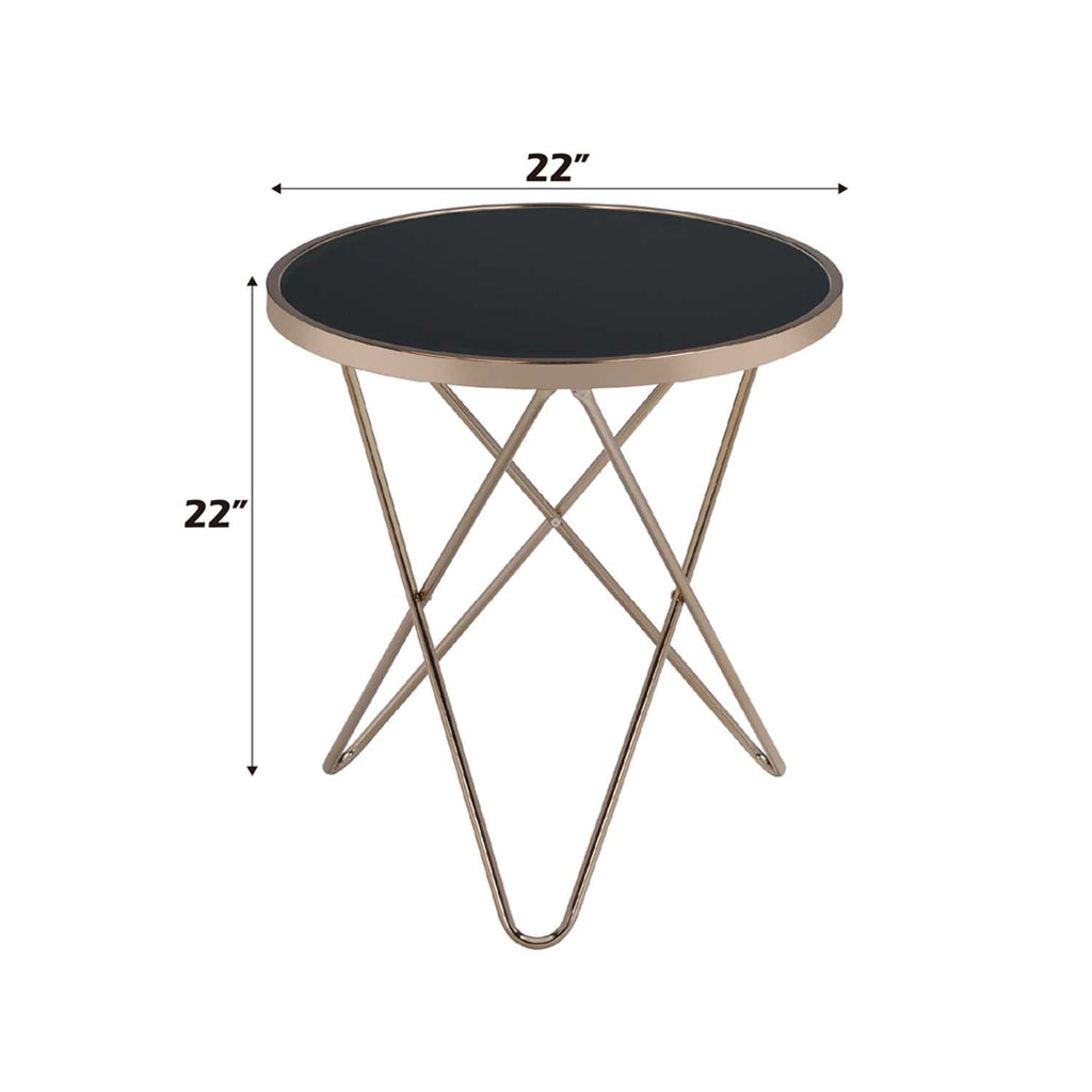 Update your living room with a functional art piece. The Valora end table uses a mid-century inspired base finished in champagne and supports a framed black glass top. The finish and black glass make for a sophisticated look.