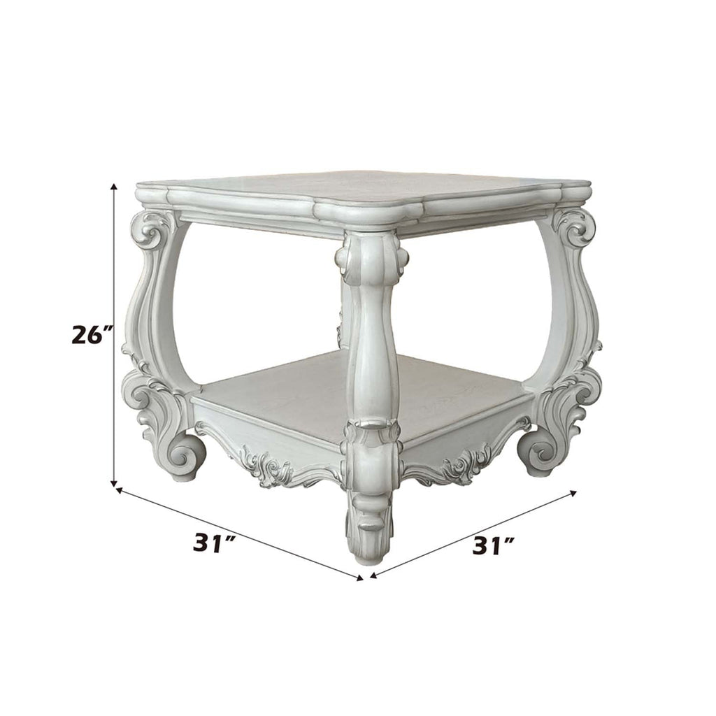 - Oversized Scrolled Legs & Shelf Apron: Poly Resin with Antique Constrast Finish