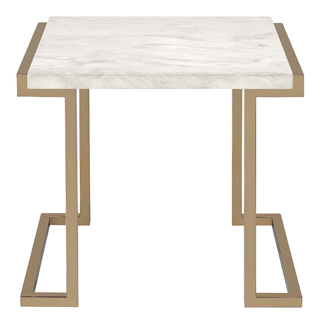 The Boice II end table set features a trending combination of sleek and contemporary style, with faux marble top and champagne finish metal base. The modern lines of the base with its open return base and simple form top, make for an modern feel and show off key elements of modern.