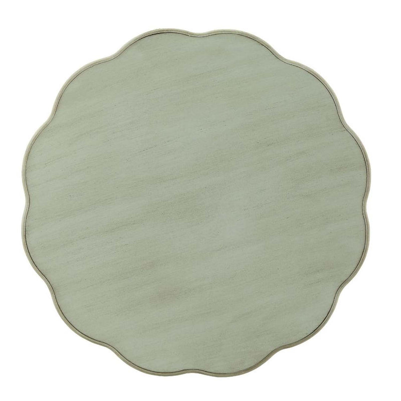 The French country-inspired Fordon end table is gracefully designed and made from quality materials. The scalloped round tabletop adds a feminine touch and the turned legs, and bottom shelf adds stability and style. This piece is carefully crafted while superb functionality is kept in mind. This end table is available in 3 inviting antique finishes green, slate, and white.