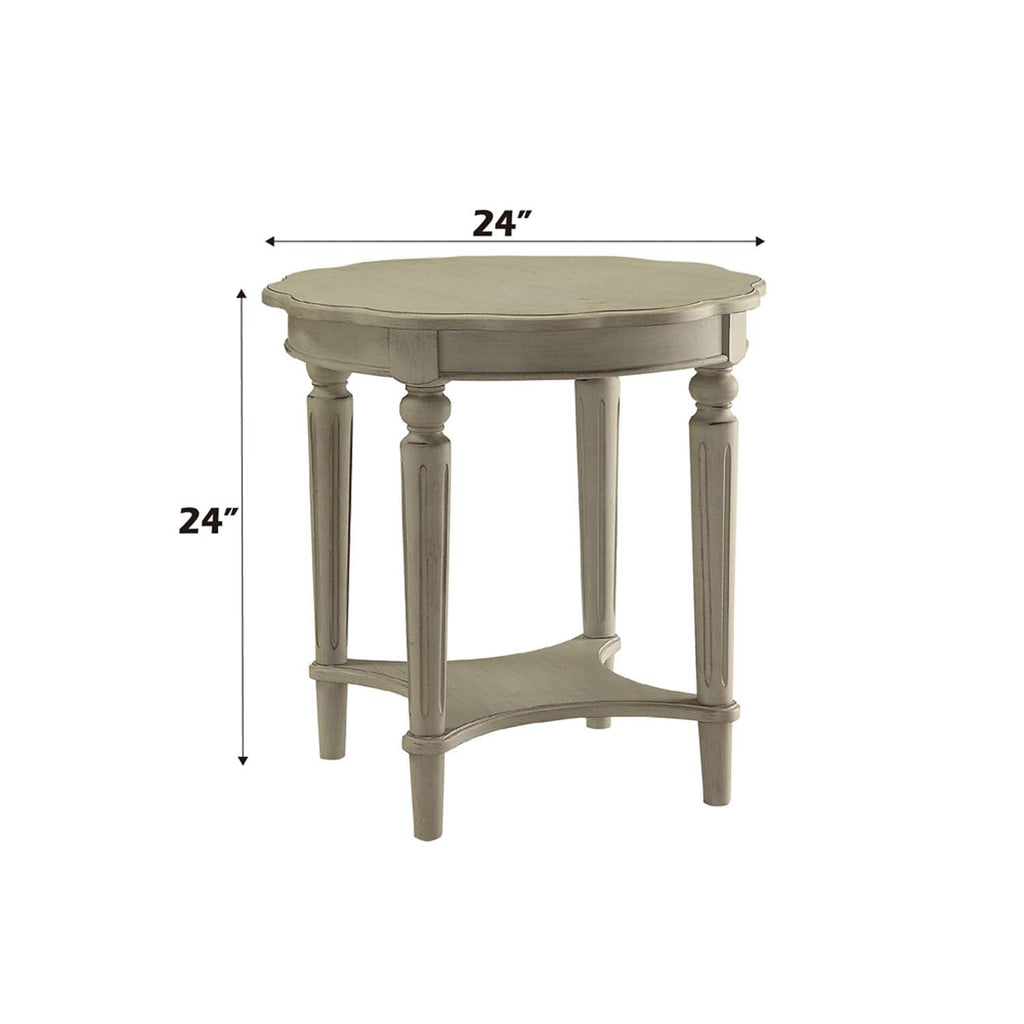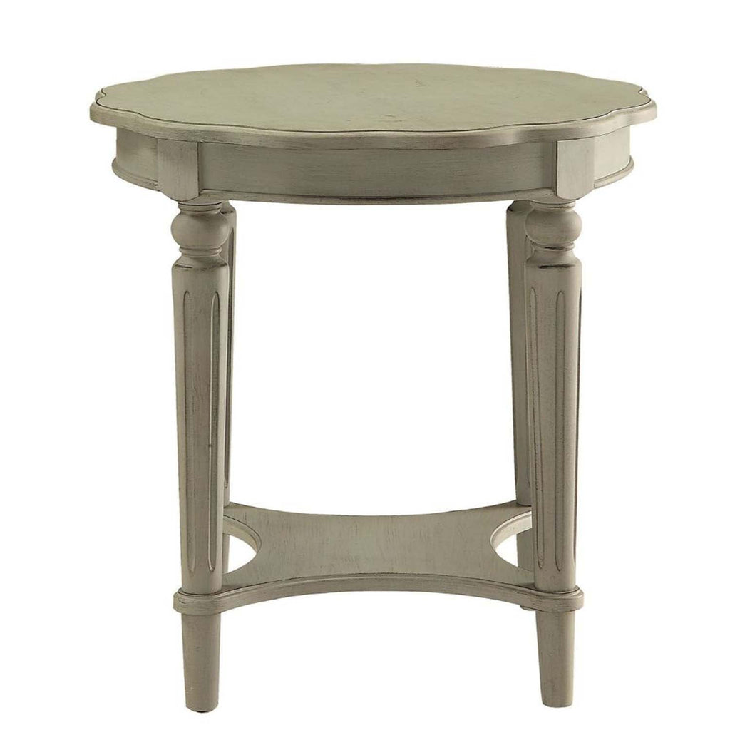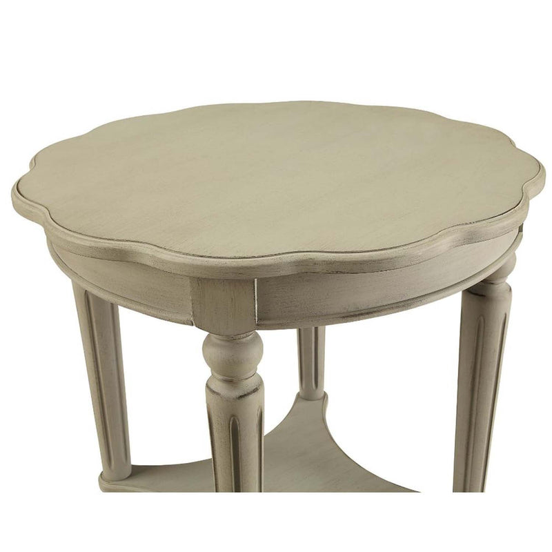 The French country-inspired Fordon end table is gracefully designed and made from quality materials. The scalloped round tabletop adds a feminine touch and the turned legs, and bottom shelf adds stability and style. This piece is carefully crafted while superb functionality is kept in mind. This end table is available in 3 inviting antique finishes green, slate, and white.