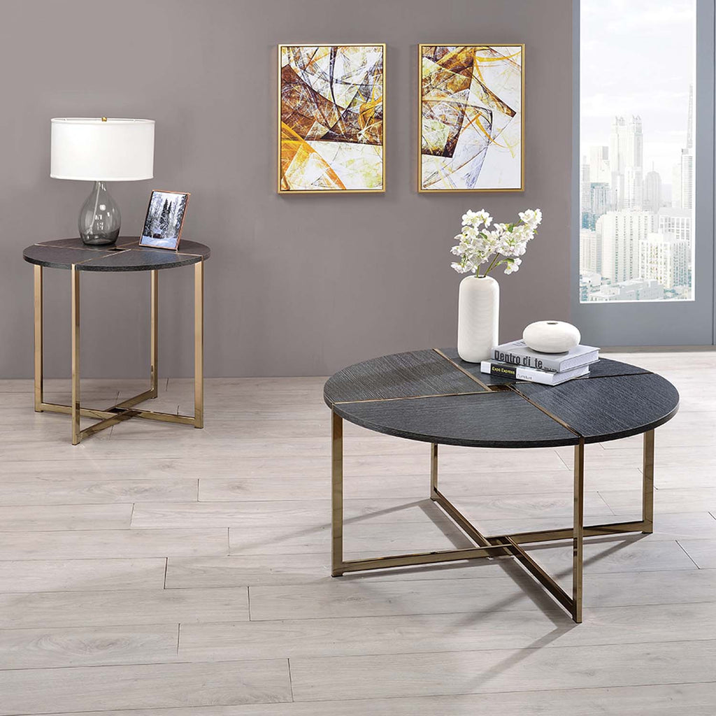 Round, fashionable, and practical. The Bromia end table is a convenient way to add a bit of flair to your home. It is expertly designed with a champagne-colored metal frame, and a black wooden tabletop that ensures it will match any decor style. The tabletop also features a fun metal design to elevate the style.
