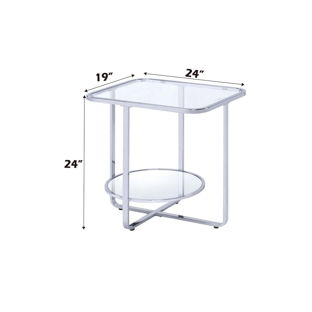 - Features: Glass Top, Mirrored Shelf, Metal Sled Base (Open Base)