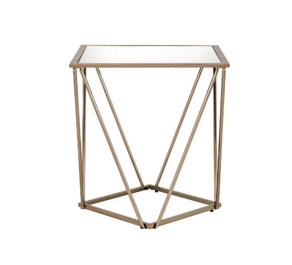 Bring dimension, depth and distinctive visual appeal to the whole space with this modern geometric design. Square table top is paired with irregular metal base, adding a uniquely attractive contrast to this table. The champagne gold finish showcases it geometric metal frame while mirrored table top infuses it with glamour. Add alluring flair and modern sophistication to your seating arrangement with the Fogya End Table.