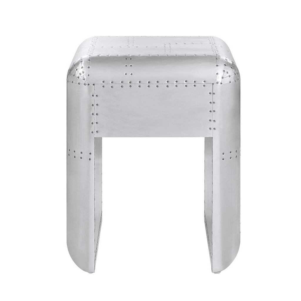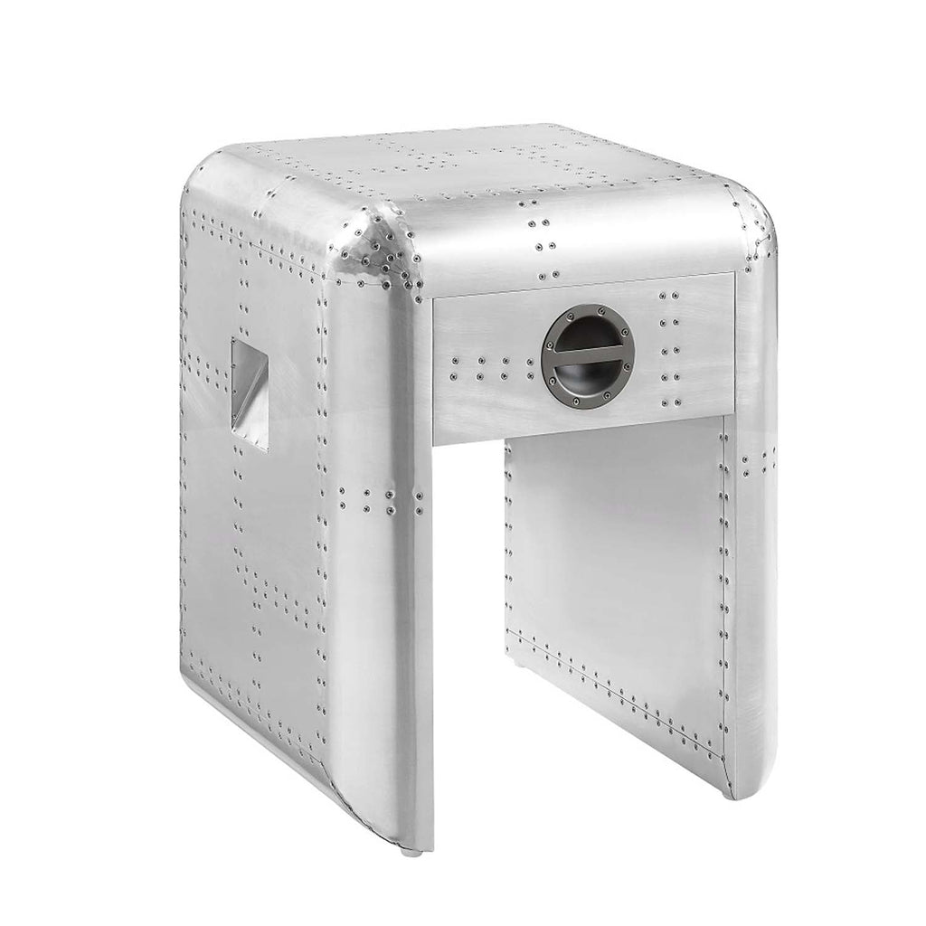 Inspired by the gleaming nose cones and fuselages of mid-20th-century aircraft, this Brancaster end table is clad in a patchwork of polished aluminum panels accented with exposed steel screws. Rounded corners and inset drawer pulls give it sleek, aerodynamic lines. It is perfect for use as an end table in your living room, a stylish nightstand in your bedroom, or even as a unique addition to your home office.