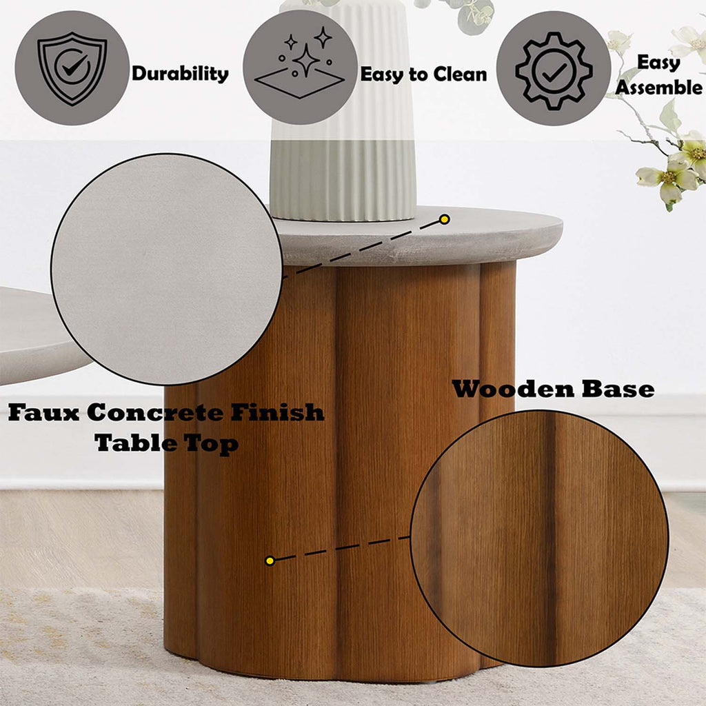 Evelyn collection features a stunning coffee table and end table, each with a round faux concrete finish table top. The robust wooden base adds warmth and durability, perfectly blending modern and rustic elements. This elegant combination brings a sophisticated touch to any living space, providing both style and functionality. Elevate your home decor with the unique design and timeless appeal of the Evelyn collection.