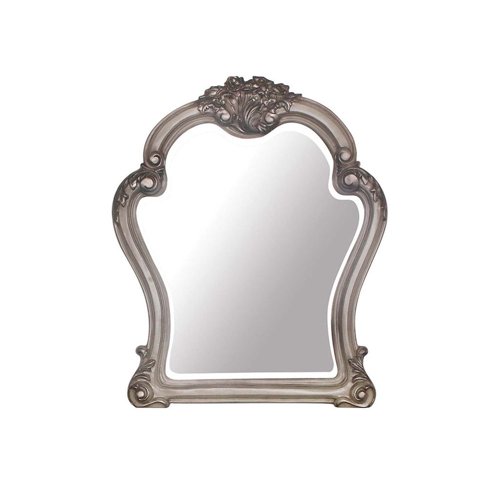 Elegant yet lightheartedly playful, this Dresden mirror is donned in an amiable Vintage Bone White finish with hand-applied burnish over the many layers of stains and finishes that are manually rubbed on, providing depth and character to this piece. The Rococo style is candidly represented in the classic ornamental features of this mirror, with the carefully chosen inlay, plentiful decorative scrolled moldings, and ample size worthy of a main bedroom. Support rails are included to be able to mount it onto the matching dresser (sold separately).