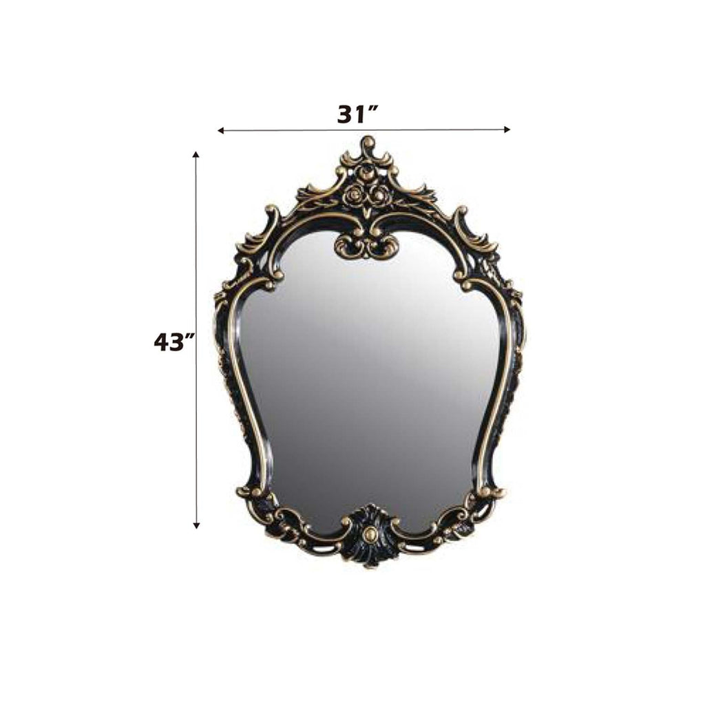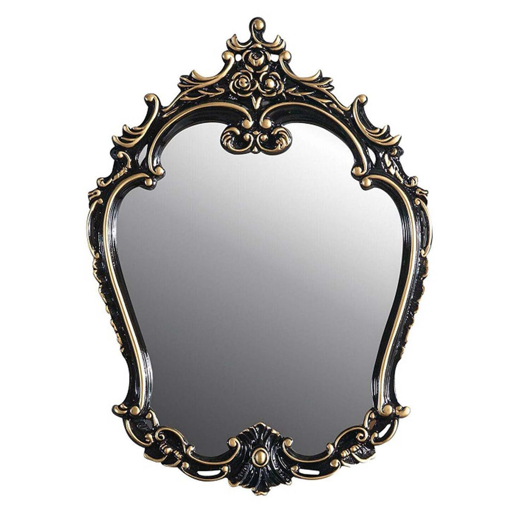 This ornamental Betria mirror is adorned with scroll and floral appliques to create a masterful piece. The mirror is finished in a piano black color with hand-brushed gold to accentuate the decorative elements. Place it in an entryway or in a bathroom to make sure you are always looking your best.
