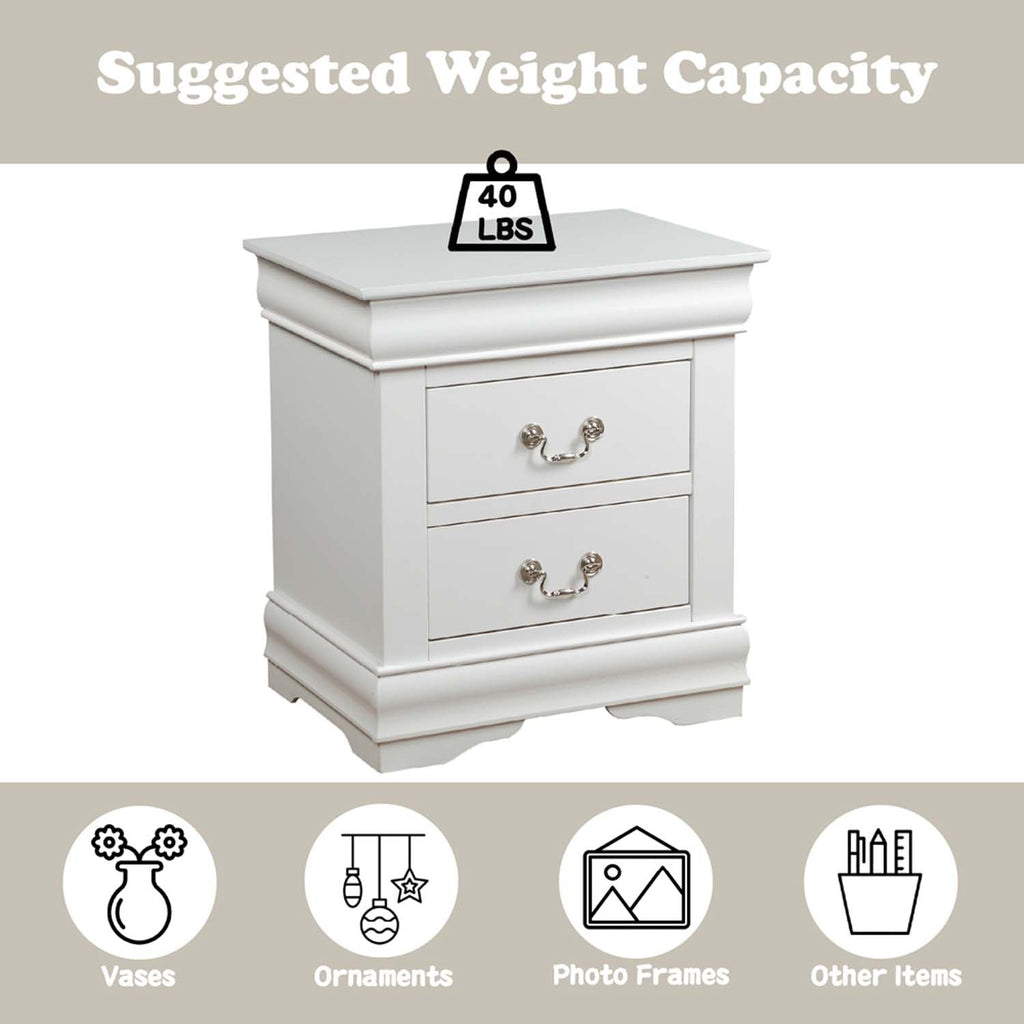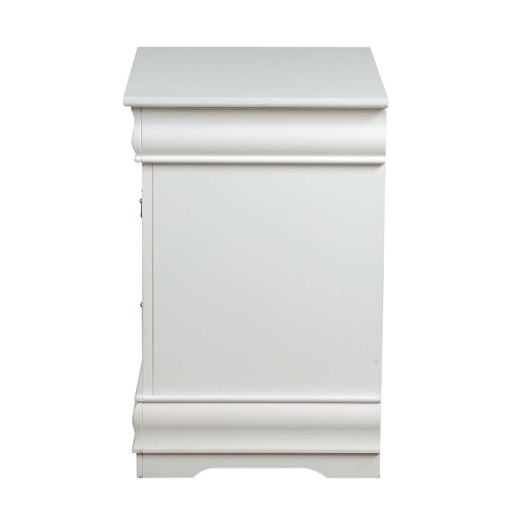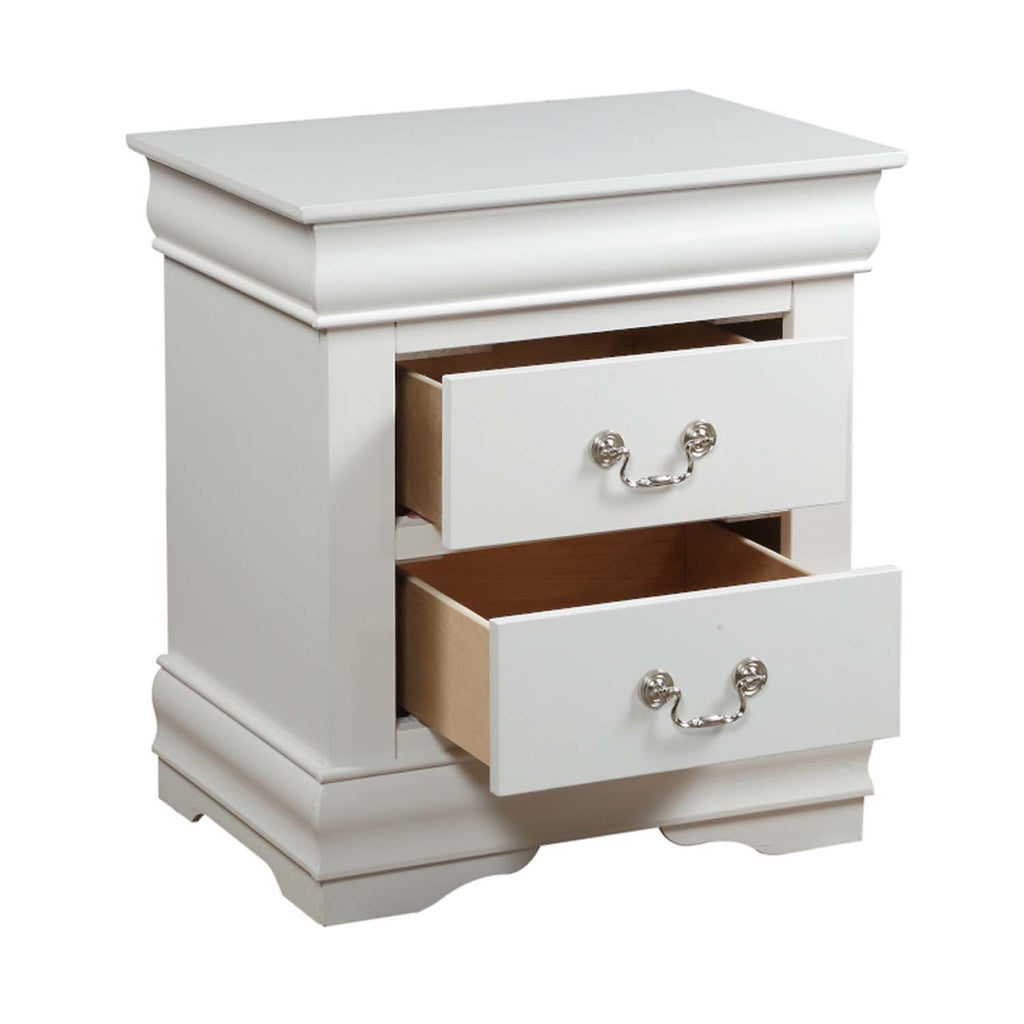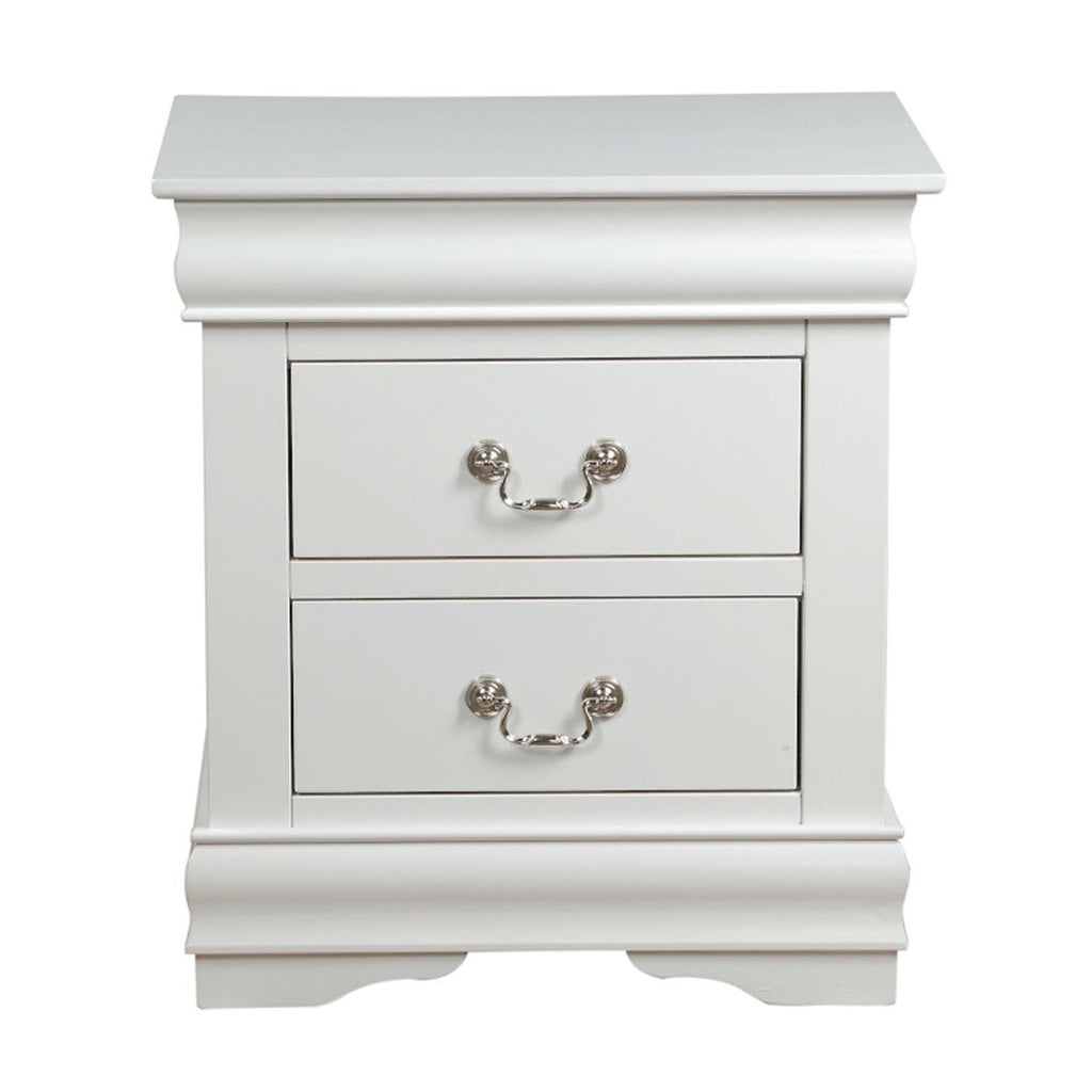 The Louis Philippe two drawer nightstand in white finish boasts engineered wood and veneer craftsmanship for enduring elegance. Brush nickel metal hardware adorns each of the drawer fronts and it's framed by crown molding detail.