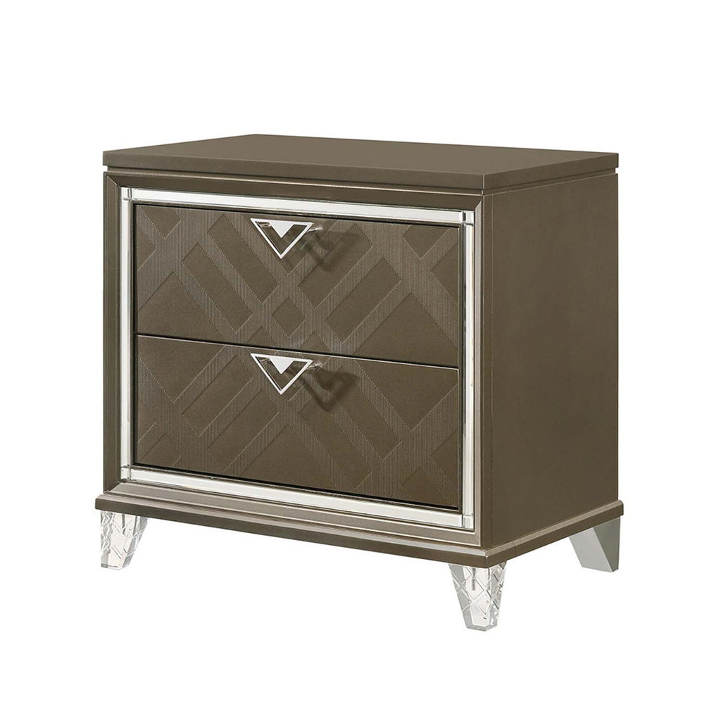 Embossed drawer fronts add incredible richness and detail to this modern glam Sylar nightstand with mirrored trim and finished in a trendy dark champagne color. Triangular knobs complement two drawers, which combine with a generous tabletop to offer plenty of bedside storage. The modern clear acrylic front legs give the illusion of a floating piece.