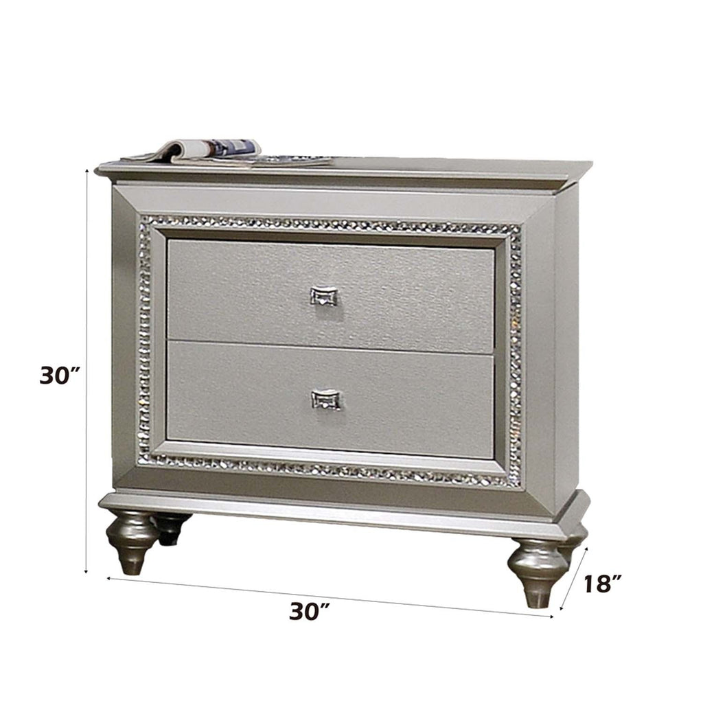 The Kaitlyn nightstand provides a commanding presence in any room. Crafted with a transitional look that is an ideal addition to any bedroom, the nightstand is accented with textured front and a crystal-like sparkling trim. Its crystal-like trimming creates dazzling glow for your master bedroom. Multiple storage drawers allow you to keep your sleeping area nicely neat.