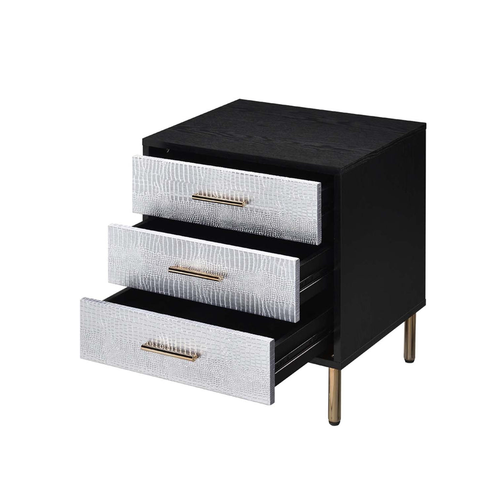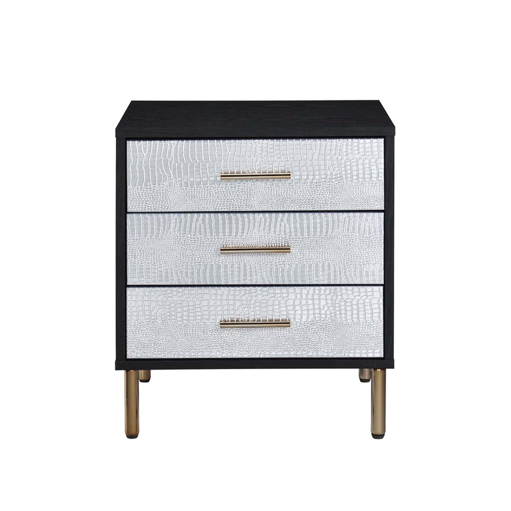 Beautify the room with a touch of Hollywood Glamor with the Myles nightstand. Visually appealing faux crocodile print adorns the 3-drawer fronts. The black wooden table frame sits atop of gold metal legs. Simple gold pulls complete the ensemble. This versatile table can be used as an end table or a nightstand.