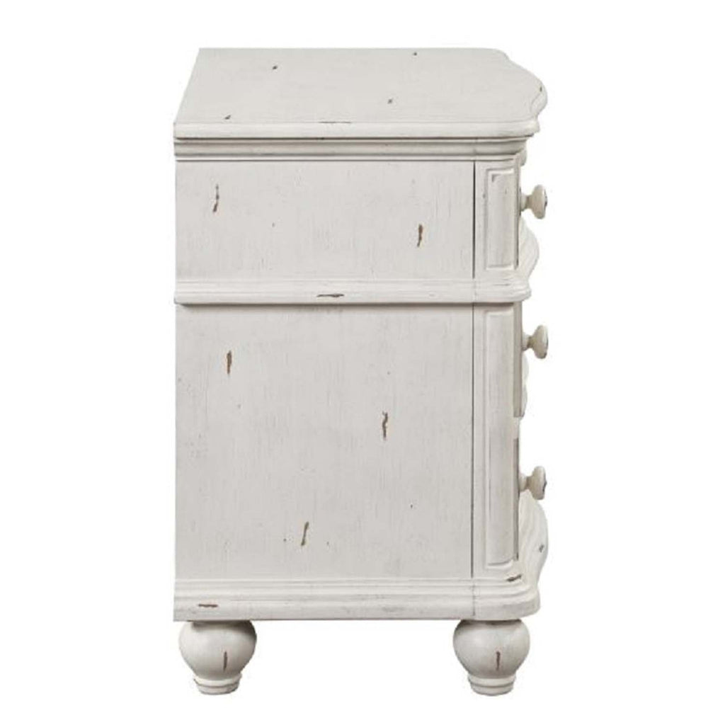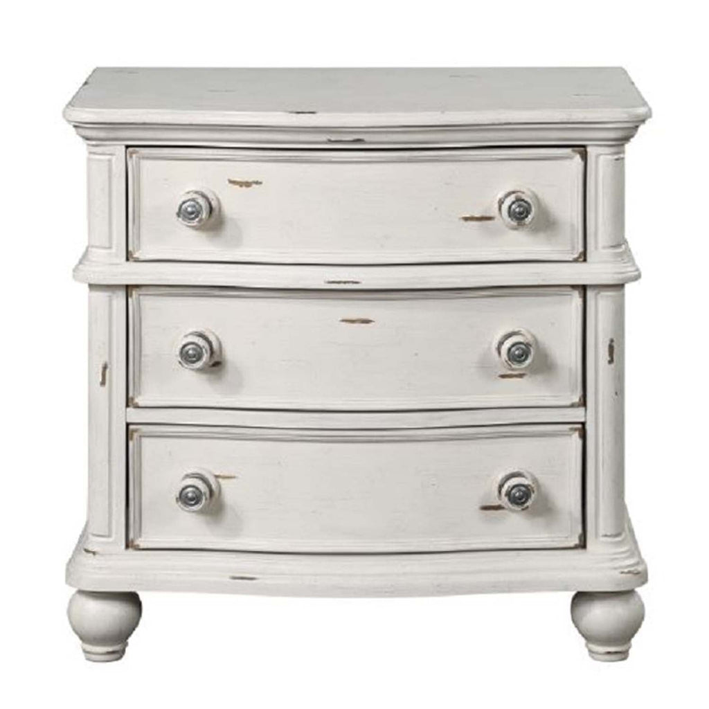 Perfect for cozying up a space, this Jaqueline nightstand is the ideal companion to any bed. It features three ample drawers that will hold all your goods within arms reach. English dovetail drawer fronts and backs provide strong construction for everyday use. This nightstand sits on wooden bun legs that are sturdy and fashionable. The antique white finish can be easily blended into various color schemes and decor styles.