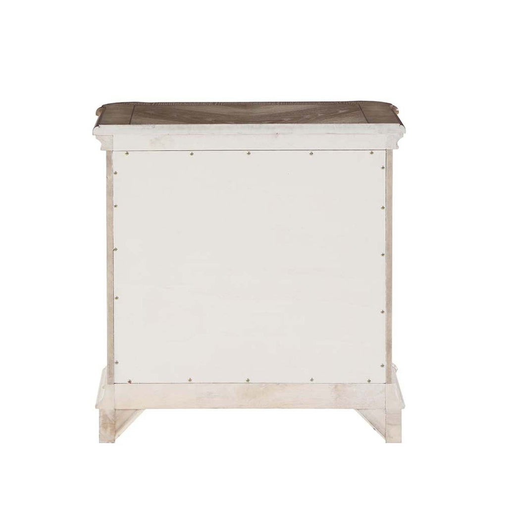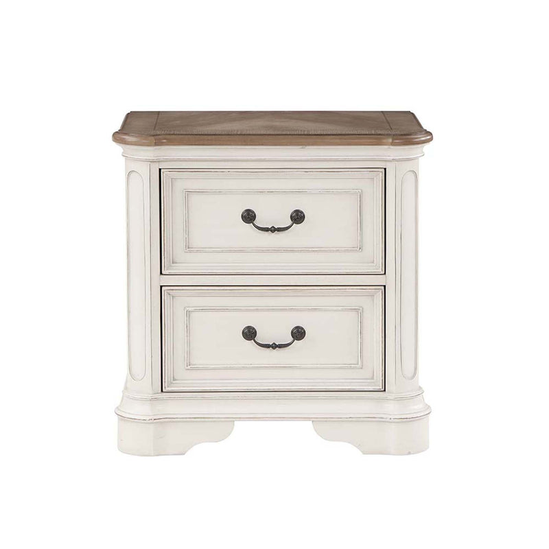 Classic design elements never go out of style the Florian nightstand is designed for the traditional home. The antique white finish gives off the right amount of distressing for a worn-in feel. The drawer fronts have raised panels to add visual interest. Offering a natural wooden finish top for contrast against the antique white finish frame. The drawers are full-extension and offer French dovetail fronts and English dovetail back construction. Comfortable, timeless, and stylish, this nightstand will bring a strong design presence to a room.