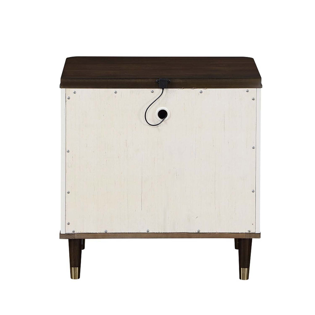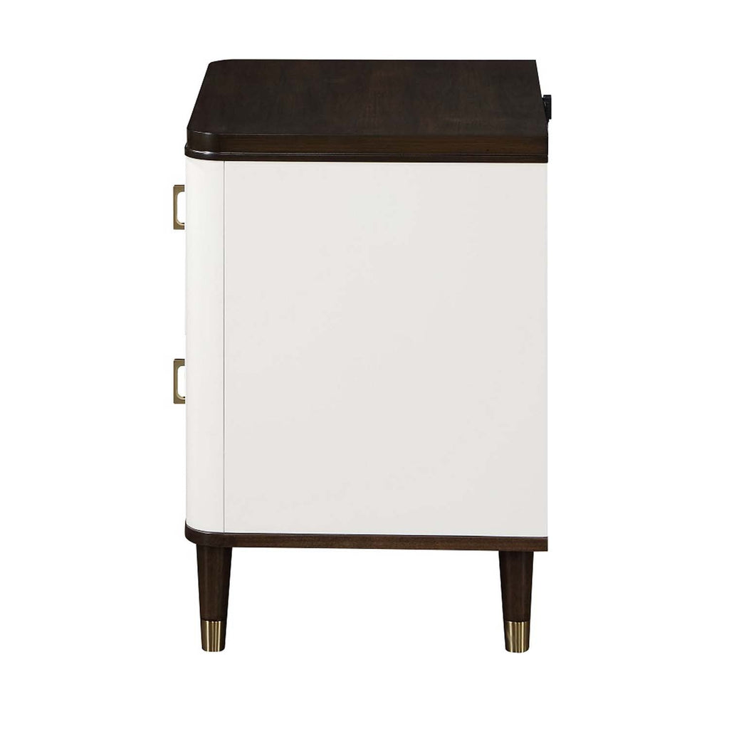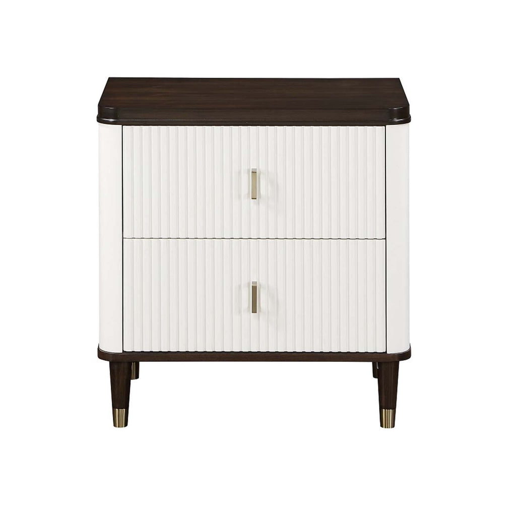 The Carena nightstand is the perfect blend of timeless design and modern functionality. This nightstand is crafted with care to enhance your bedroom's style and comfort. The white and brown finish exudes an understated elegance, creating an inviting atmosphere. The slatted drawer fronts of this piece provide visual appeal, while the two drawers add function to your bedroom. The tapered legs with metal tips add a touch of sophistication and durability. Perfect for anyone who values style and functionality.
