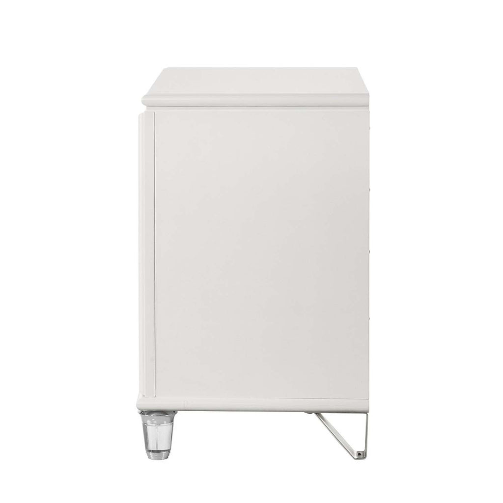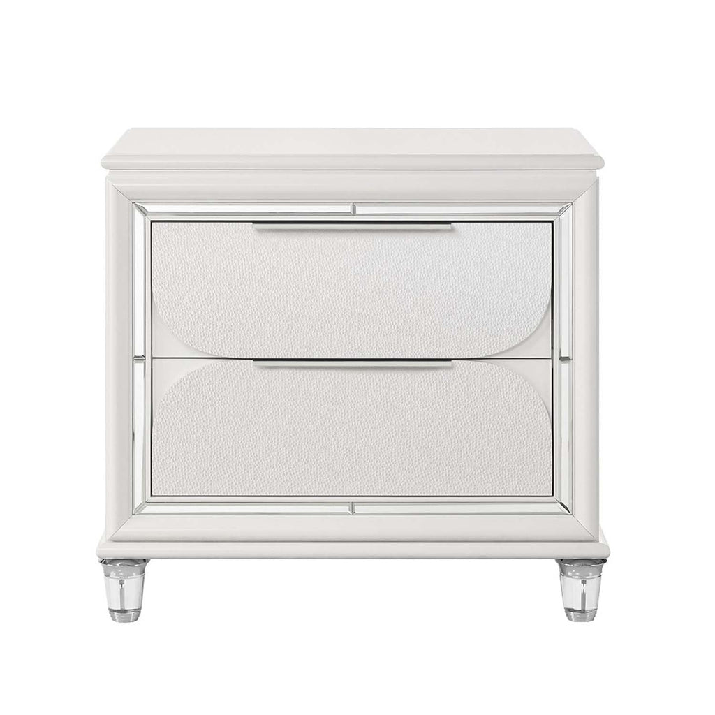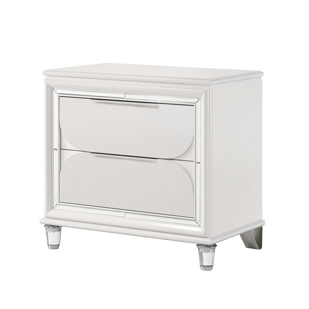 The Tarian nightstand will add stylish glamour with a refined touch of glitz to your bedroom! Sturdily crafted for long-term use, this bed is finished in a fresh and alluring pearl white. This piece offers two deep storage drawers to help keep your bedside organized and tidy. Mirrored-finished trim and elongated drawer pulls on the drawer fronts add captivating pizzazz. It stands on sturdy clear acrylic legs that make the bed appear as if it is floating.