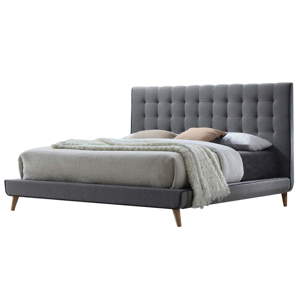 - Fully Padded Bed, Buttonless Tufted Headboard: Light Gray Fabric w/Black Piping