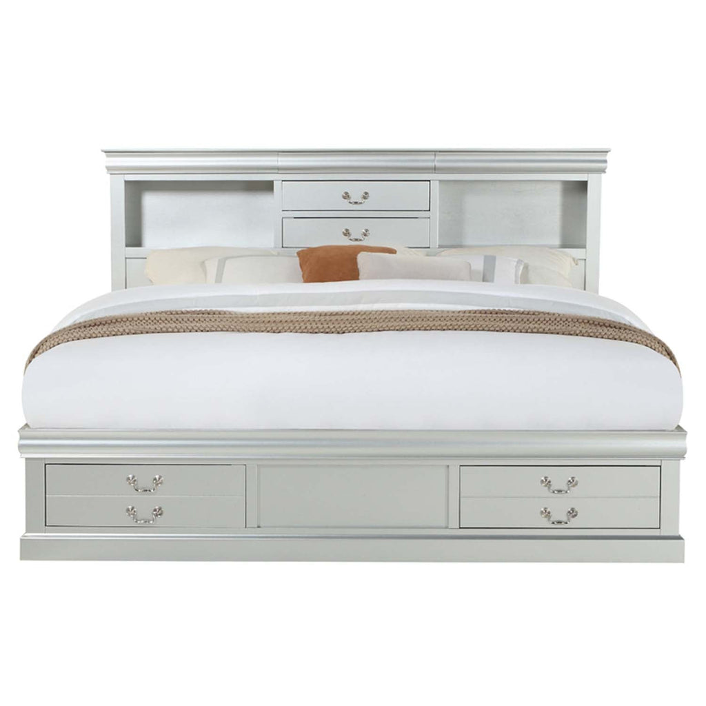 The Louis Philippe III storage bed is exclusively designed and filled with romantic spirit. A piece crafted and inspired by the luxurious designs of the past, this gorgeous bed features a stunning rectangular bookcase headboard and low profile footboard all in an elegant platinum finish. Expertly detailed, this unique bed provides plenty of storage space with five drawers on the headboard and two drawers on the footboard. This collection will make the perfect companion for your favorite bedroom style, available in different colors to choose from cherry, white, black and antique gray.
