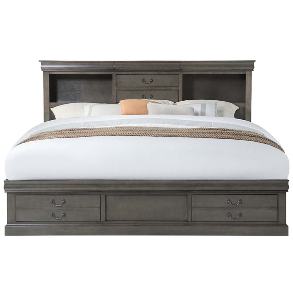 The Louis Philippe III storage bed is exclusively designed and filled with romantic spirit. A piece crafted and inspired by the luxurious designs of the past, this gorgeous bed features a stunning rectangular bookcase headboard and low profile footboard all in an elegant dark gray finish. Expertly detailed, this unique bed provides plenty of storage space with five drawers on the headboard and two drawers on the footboard. This collection will make the perfect companion for your favorite bedroom style, available in different colors to choose from cherry, white, black and antique gray.