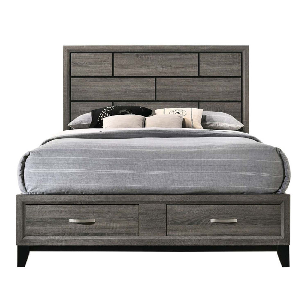 - Wooden Bed, Headboard Grooved Patterned, Weathered Finish